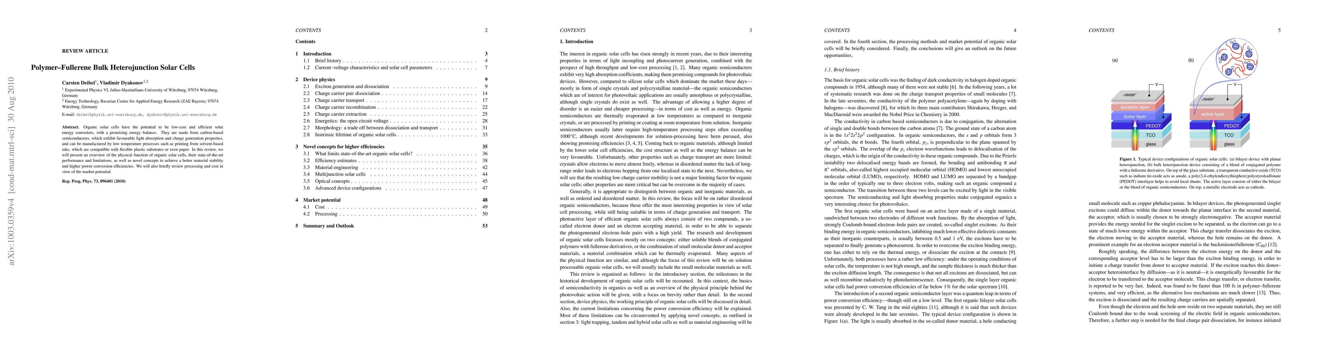 This review provides an overview of polymer-fullerene bulk heterojunction solar cells, focusing on their physical function, current performance, and limitations. It also explores novel concepts for enhancing material stability and efficiency, alongside processing methods and cost considerations for market potential.