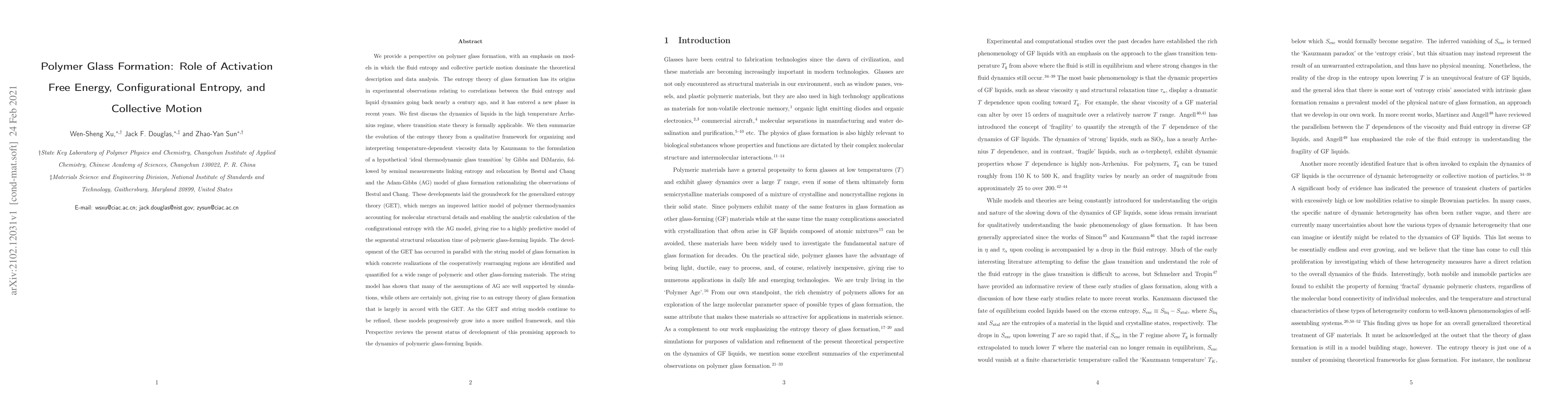 This paper reviews the theoretical models and experimental data that explain polymer glass formation, focusing on the dynamics of liquids and the role of entropy and collective motion. It highlights the evolution from the Arrhenius regime to the generalized entropy theory (GET), which integrates structural details and the Adam-Gibbs model, and discusses the complementary string model, which identifies cooperatively rearranging regions.