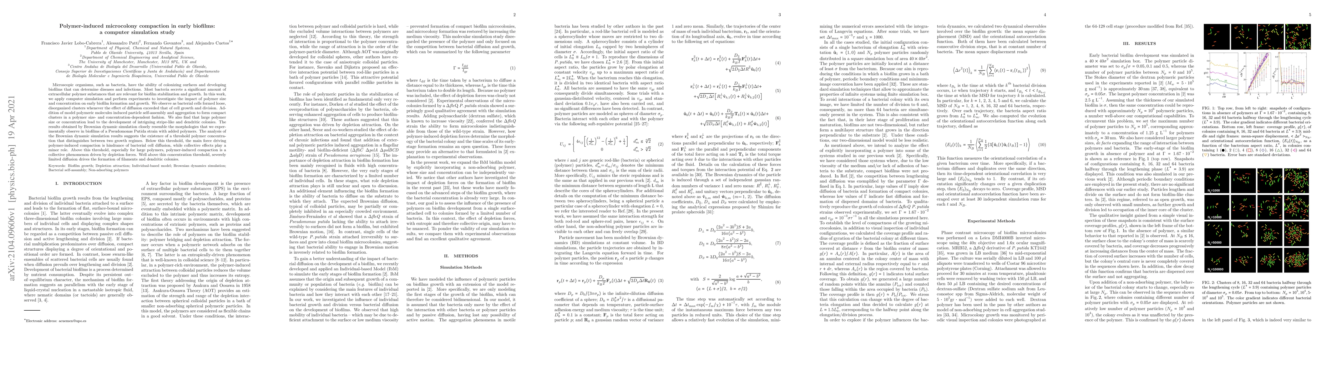 This study uses computer simulations and experiments to explore how polymer size and concentration affect early biofilm formation by bacteria. It finds that polymer-induced compaction leads to compact clusters and complex colony patterns, with a threshold concentration distinguishing between compaction driven by diffusion hindrance and collective effects.