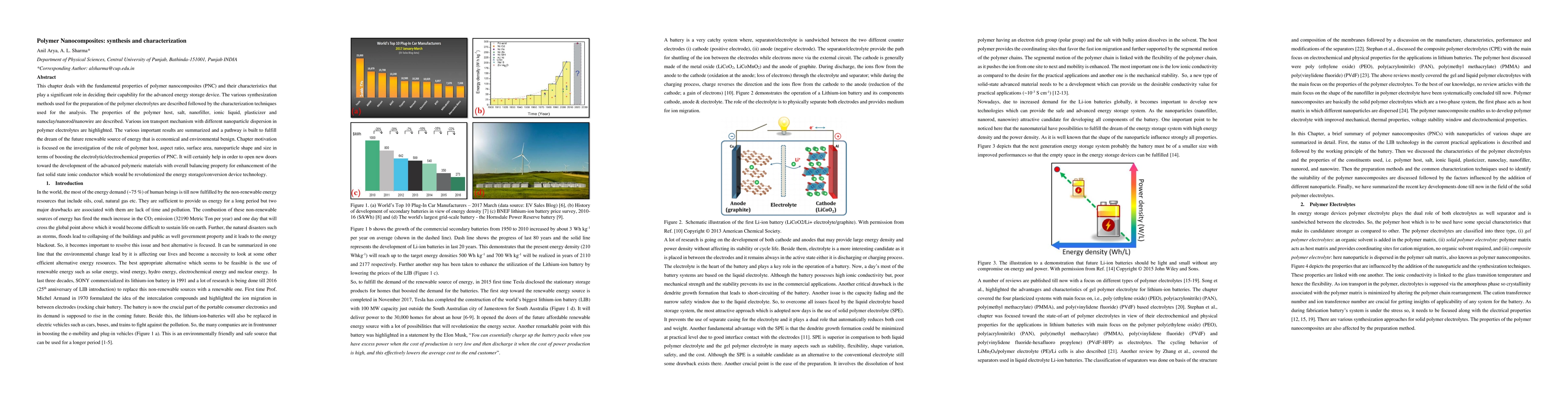 This paper investigates the synthesis and characterization of polymer nanocomposites (PNC) for advanced energy storage devices, emphasizing the influence of polymer host properties and nanoparticle characteristics on ion transport mechanisms. The chapter highlights various synthesis methods and characterization techniques, aiming to develop cost-effective and environmentally friendly renewable energy sources.