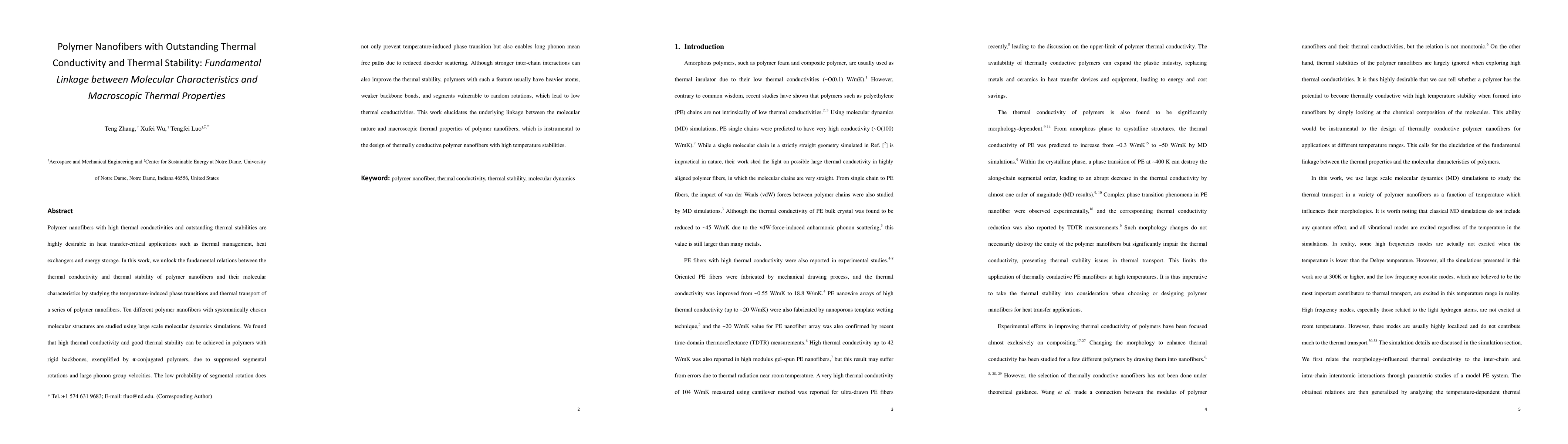 This research investigates the relationship between molecular characteristics and macroscopic thermal properties of polymer nanofibers, revealing that rigid backbones, such as those in π-conjugated polymers, enhance both thermal conductivity and stability by minimizing segmental rotations and disorder scattering. The study uses molecular dynamics simulations to demonstrate how these molecular features influence thermal performance in heat transfer applications.