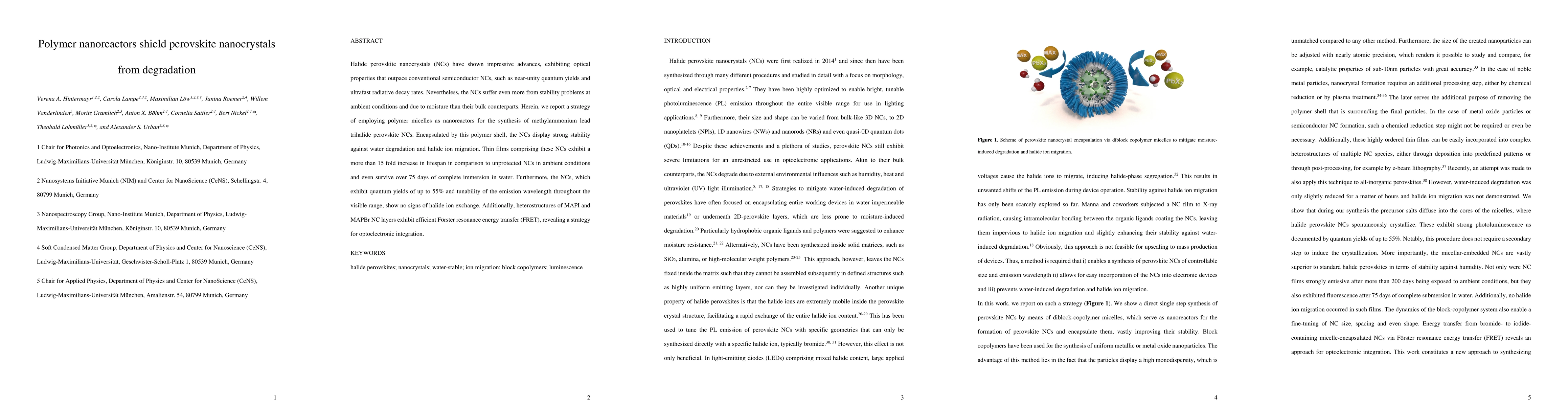 This paper presents a method using polymer nanoreactors to synthesize perovskite nanocrystals that exhibit enhanced stability against degradation, particularly in moisture. The encapsulated nanocrystals show a significant increase in lifespan and maintain their optical properties, indicating potential for optoelectronic applications.