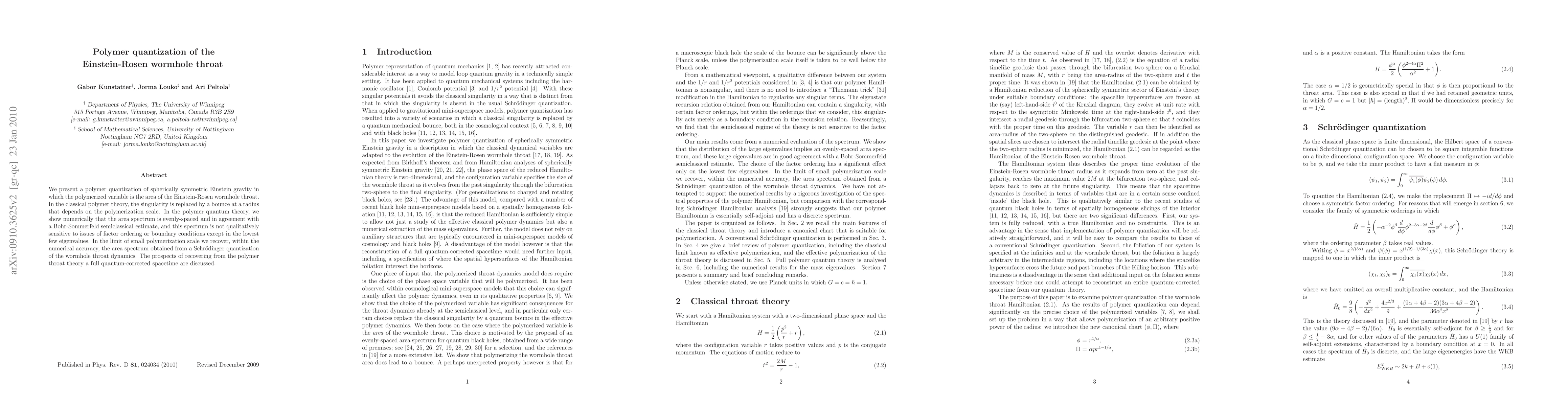 This paper quantizes the Einstein-Rosen wormhole throat using polymer quantization, showing that the singularity is replaced by a bounce and that the area spectrum is evenly-spaced, aligning with Bohr-Sommerfeld estimates. The study discusses the prospects of obtaining quantum-corrected spacetime from this polymer theory.