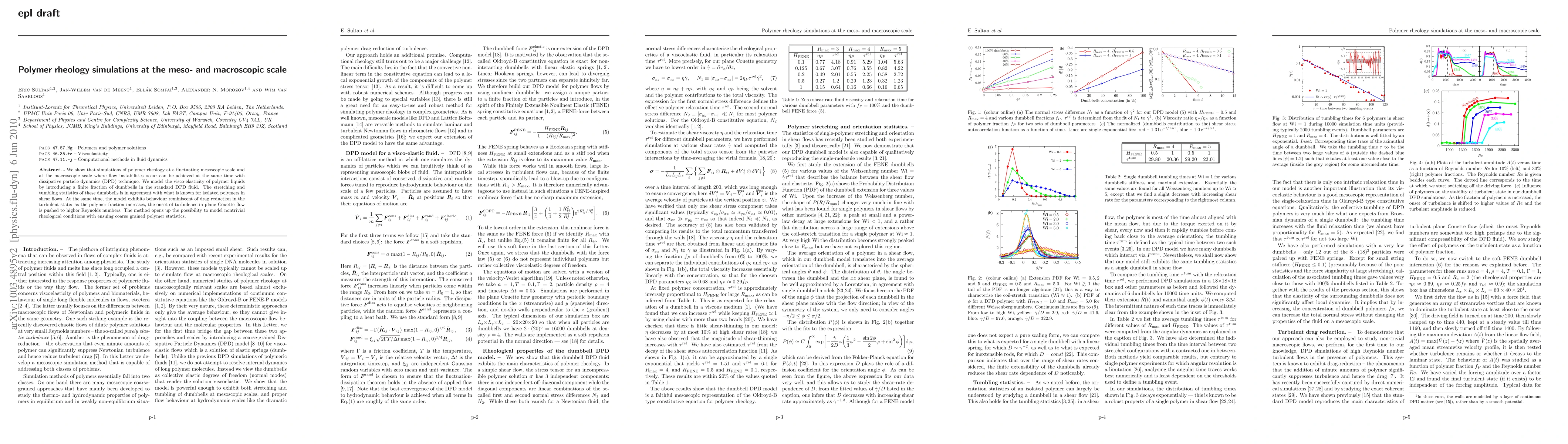 We show that simulations of polymer rheology at a fluctuating mesoscopic scale and at the macroscopic scale where flow instabilities occur can be achieved at the same time with dissipative particle dynamics (DPD) technique.} We model the visco-elasticity of polymer liquids by introducing a finite fraction of dumbbells in the standard DPD fluid. The stretching and tumbling statistics of these dumbbells is in agreement with what is known for isolated polymers in shear flows. At the same time, the model exhibits behaviour reminiscent of drag reduction in the turbulent state: as the polymer fraction increases, the onset of turbulence in plane Couette flow is pushed to higher Reynolds numbers. The method opens up the possibility to model nontrivial rheological conditions with ensuing coarse grained polymer statistics.