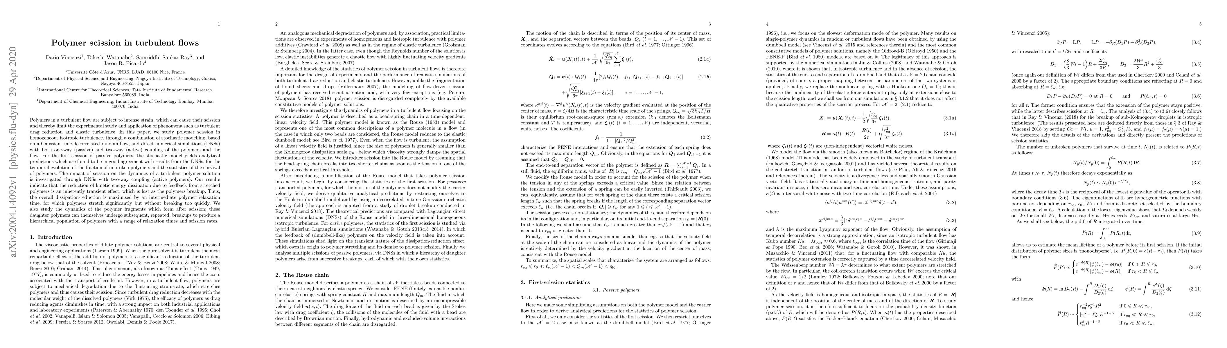 This paper investigates polymer scission in turbulent flows using stochastic modelling and direct numerical simulations, finding that polymer breakup limits drag reduction and elastic turbulence. The study reveals that optimal dissipation reduction occurs with intermediate polymer relaxation times, and explores the dynamics of polymer fragments post-scission.