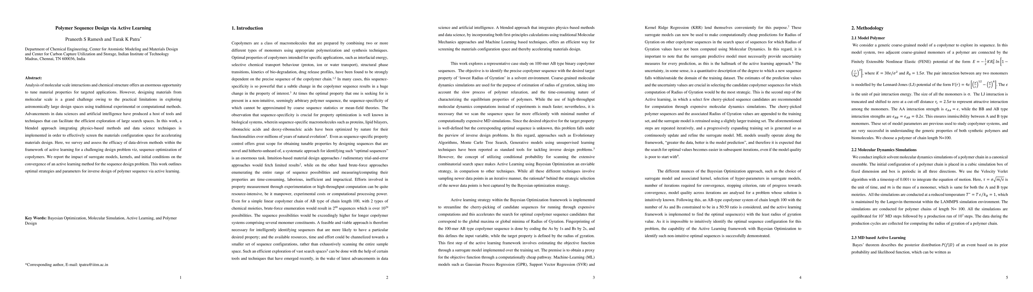 Analysis of molecular scale interactions and chemical structure offers an enormous opportunity to tune material properties for targeted applications. However, designing materials from molecular scale is a grand challenge owing to the practical limitations in exploring astronomically large design spaces using traditional experimental or computational methods. Advancements in data sciences and artificial intelligence have produced a host of tools and techniques that can facilitate the efficient exploration of large search spaces. In this work, a blended approach integrating physics-based methods and data science techniques is implemented in order to effectively screen the materials configuration space for accelerating materials design. Here, we survey and assess the efficacy of data-driven methods within the framework of active learning for a challenging design problem viz, sequence optimization of copolymers. We report the impact of surrogate models, kernels, and initial conditions on the convergence of an active learning method for the sequence design problem. This work outlines optimal strategies and parameters for inverse design of polymer sequence via active learning.