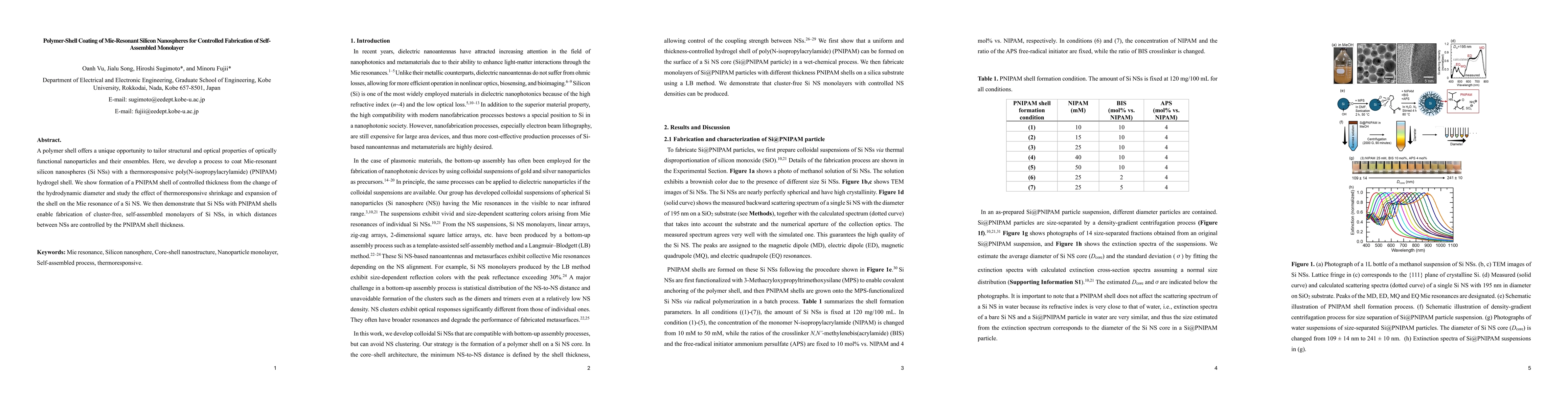 This research introduces a method to coat silicon nanospheres with a thermoresponsive polymer shell, enabling control over their structural and optical properties. The coating facilitates the formation of cluster-free, self-assembled monolayers with tunable inter-nanosphere distances.