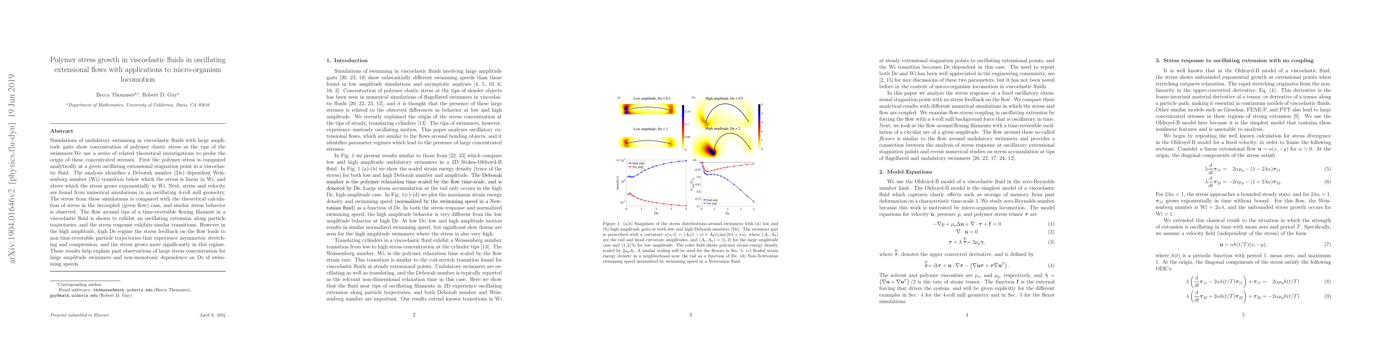This paper investigates the polymer stress growth in viscoelastic fluids during oscillatory extensional flows, revealing stress concentration at the tips of undulatory swimmers. Theoretical and numerical analyses show a Deborah number-dependent transition where stress grows exponentially with Weissenberg number above a certain threshold, explaining large stress concentrations and non-monotonic swimming speed dependence in high amplitude regimes.