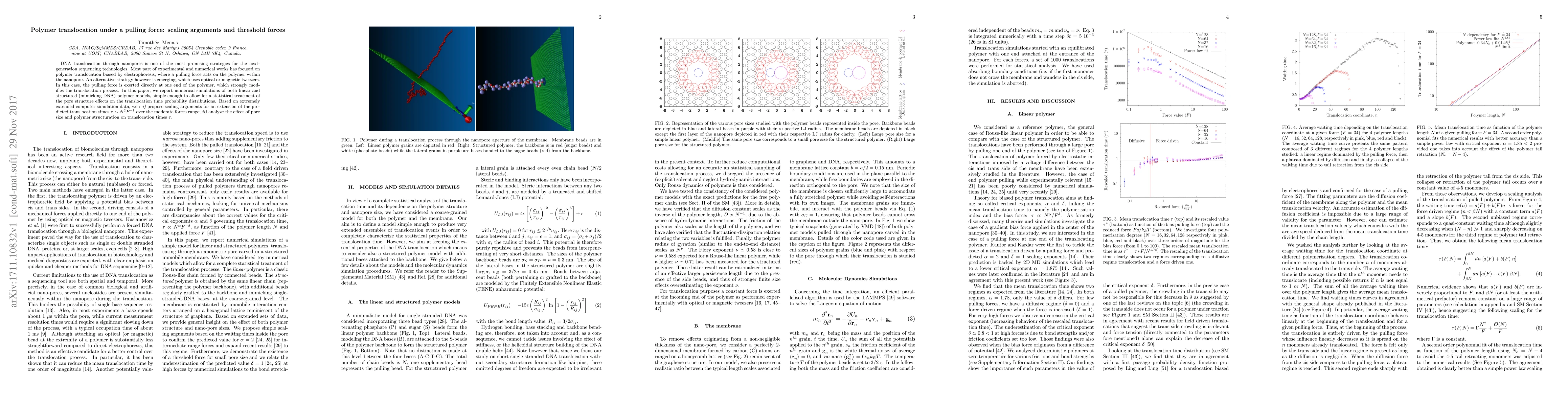 DNA translocation through nanopores is one of the most promising strategies for the next-generation sequencing technologies. Most part of experimental and numerical works has focused on polymer translocation biased by electrophoresis, where a pulling force acts on the polymer within the nanopore. An alternative strategy however is emerging, which uses optical or magnetic tweezers. In this case, the pulling force is exerted directly at one end of the polymer, which strongly modifies the translocation process. In this paper, we report numerical simulations of both linear and structured (mimicking DNA) polymer models, simple enough to allow for a statistical treatment of the pore structure effects on the translocation time probability distributions. Based on extremely extended computer simulation data, we : i) propose scaling arguments for an extension of the predicted translocation times $\tau \sim N^{2}F^{-1}$ over the moderate forces range; ii) analyze the effect of pore size and polymer structuration on translocation times $\tau$.