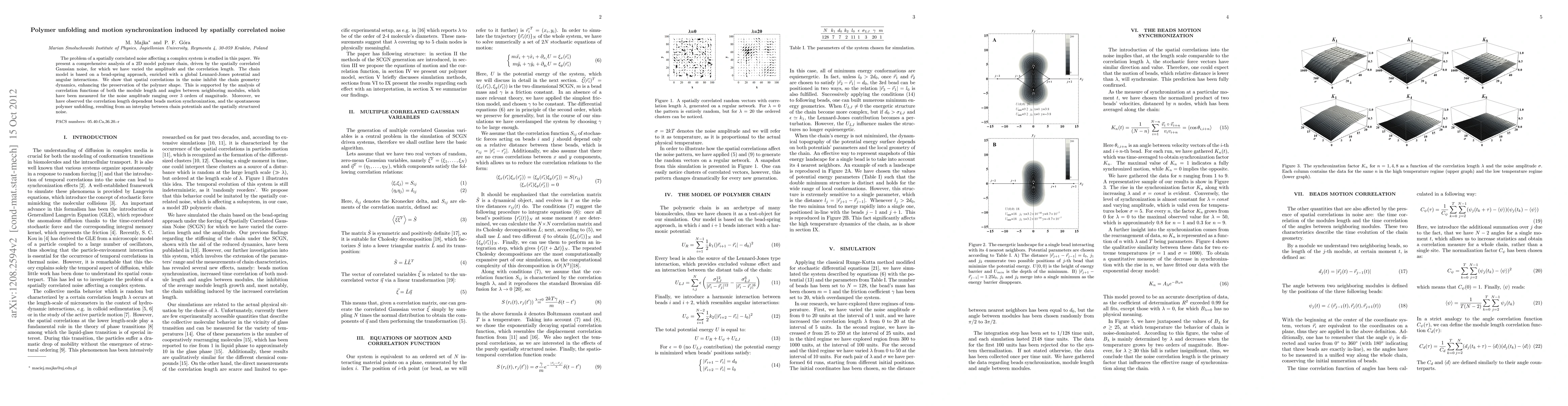 This paper investigates a 2D polymer chain model driven by spatially correlated Gaussian noise, revealing that such noise inhibits chain dynamics and preserves polymer shape. It also uncovers synchronization in bead motion and spontaneous unfolding due to the interplay between chain potentials and the structured noise.