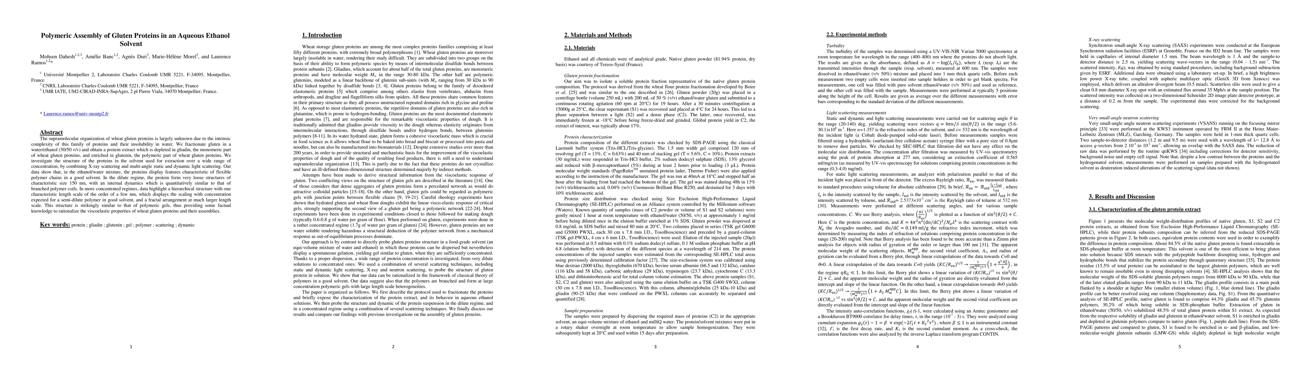 This study investigates the supramolecular organization of wheat gluten proteins in a water/ethanol solvent, revealing that glutenin, the polymeric part, forms flexible polymer chains and hierarchical structures similar to polymeric gels, providing insights into the viscoelastic properties of gluten. The findings are based on X-ray scattering and multi-angle light scattering techniques.