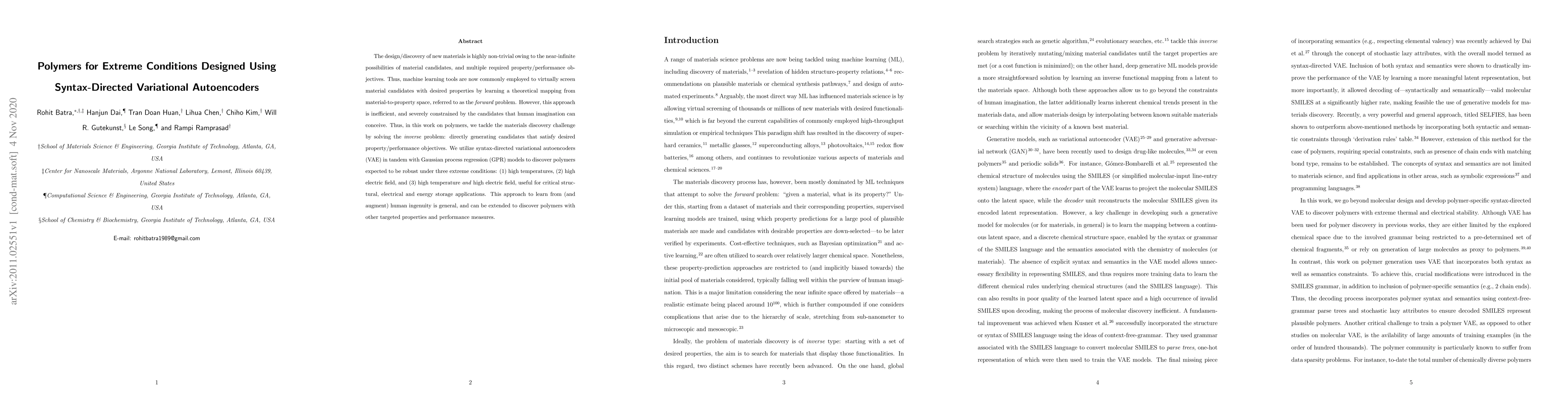 This research employs syntax-directed variational autoencoders (VAE) in conjunction with Gaussian process regression (GPR) models to generate polymers for extreme conditions, specifically high temperatures, high electric fields, and both combined. The VAE encodes polymer SMILES strings into a continuous latent space, while GPR models predict properties based on these latent representations.