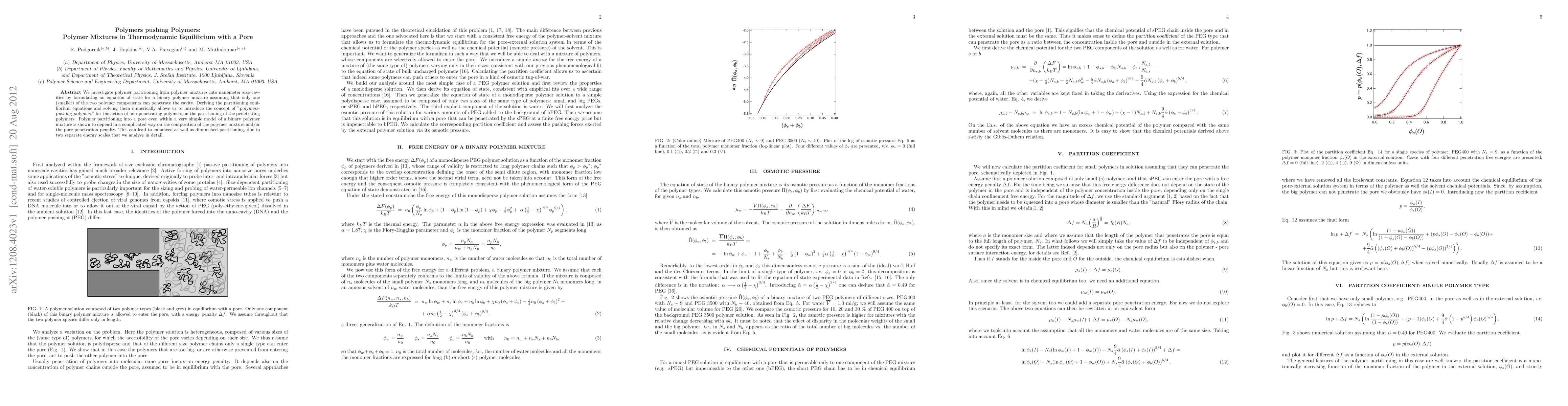 We investigate polymer partitioning from polymer mixtures into nanometer size cavities by formulating an equation of state for a binary polymer mixture assuming that only one (smaller) of the two polymer components can penetrate the cavity. Deriving the partitioning equilibrium equations and solving them numerically allows us to introduce the concept of "polymers-pushing-polymers" for the action of non-penetrating polymers on the partitioning of the penetrating polymers. Polymer partitioning into a pore even within a very simple model of a binary polymer mixture is shown to depend in a complicated way on the composition of the polymer mixture and/or the pore-penetration penalty. This can lead to enhanced as well as diminished partitioning, due to two separate energy scales that we analyse in detail.