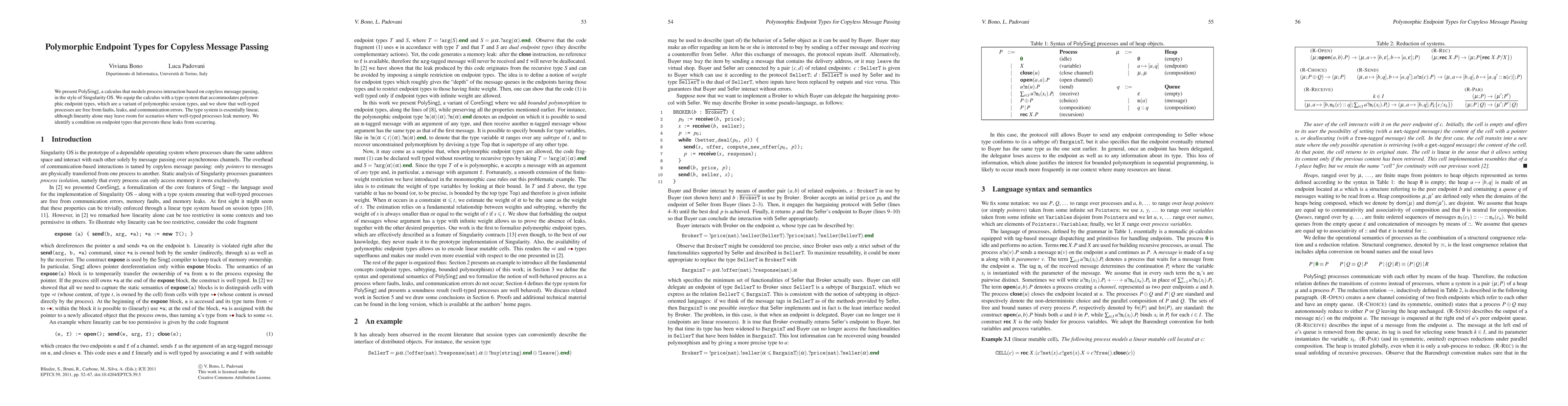 PolySing# is a novel calculus for process interaction using copyless message passing, featuring a type system for polymorphic endpoint types. The linear type system ensures fault-free, leak-free, and error-free communication, with an additional condition on endpoint types to prevent memory leaks.