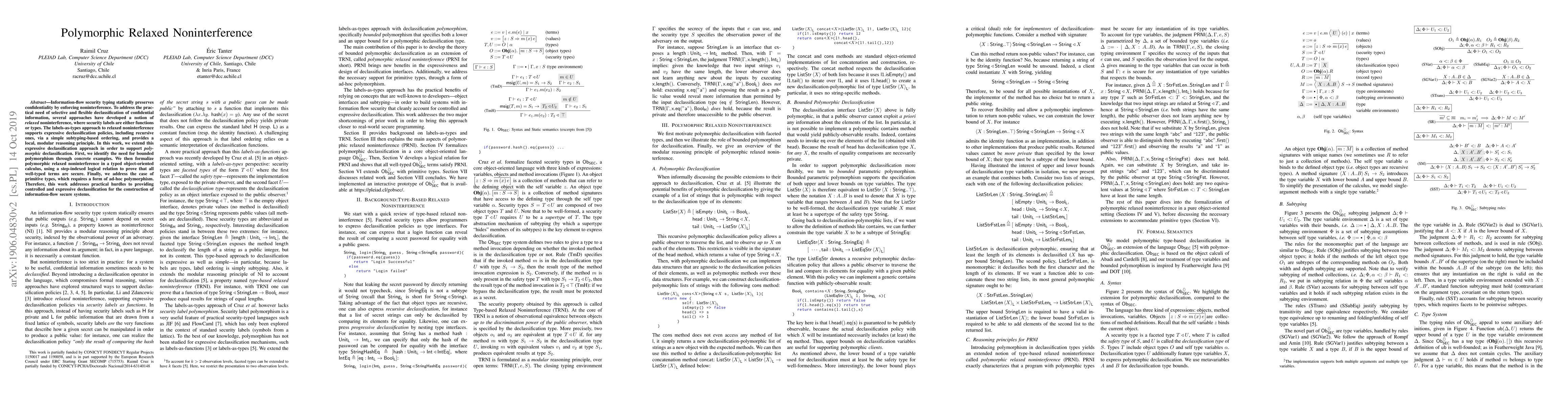 The paper extends relaxed noninterference to support polymorphic declassification, formalizing it in a typed object-oriented calculus using step-indexed logical relations to prove security.