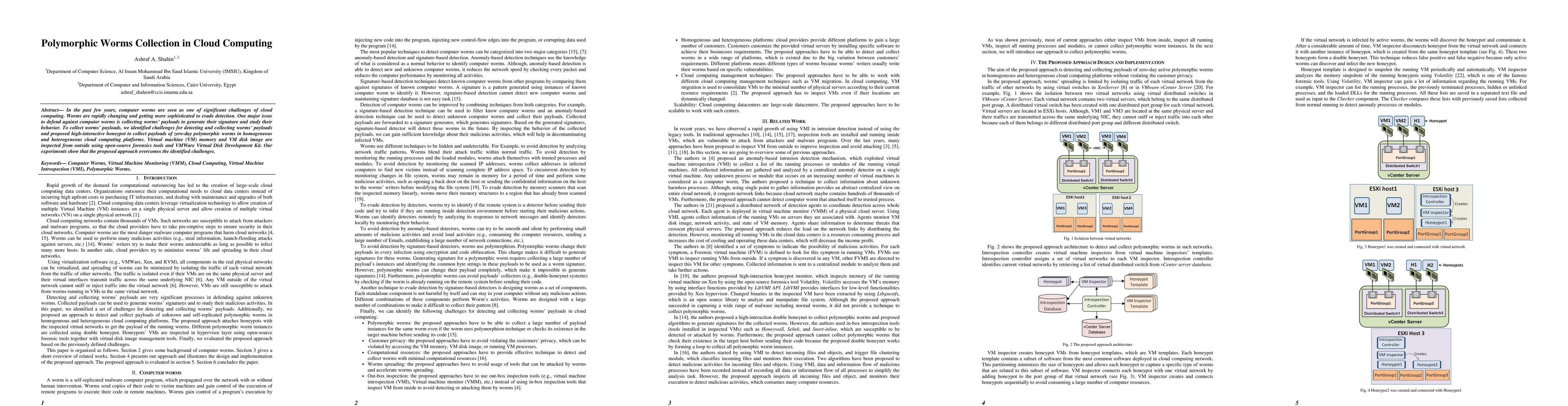 In the past few years, computer worms are seen as one of significant challenges of cloud computing. Worms are rapidly changing and getting more sophisticated to evade detection. One major issue to defend against computer worms is collecting worms' payloads to generate their signature and study their behavior. To collect worms' payloads, we identified challenges for detecting and collecting worms' payloads and proposed high-interactive honeypot to collect payloads of zero-day polymorphic worms in homogeneous and heterogeneous cloud computing platforms. Virtual machine (VM) memory and VM disk image are inspected from outside using open-source forensics tools and VMWare Virtual Disk Development Kit. Our experiments show that the proposed approach overcomes the identified challenges.