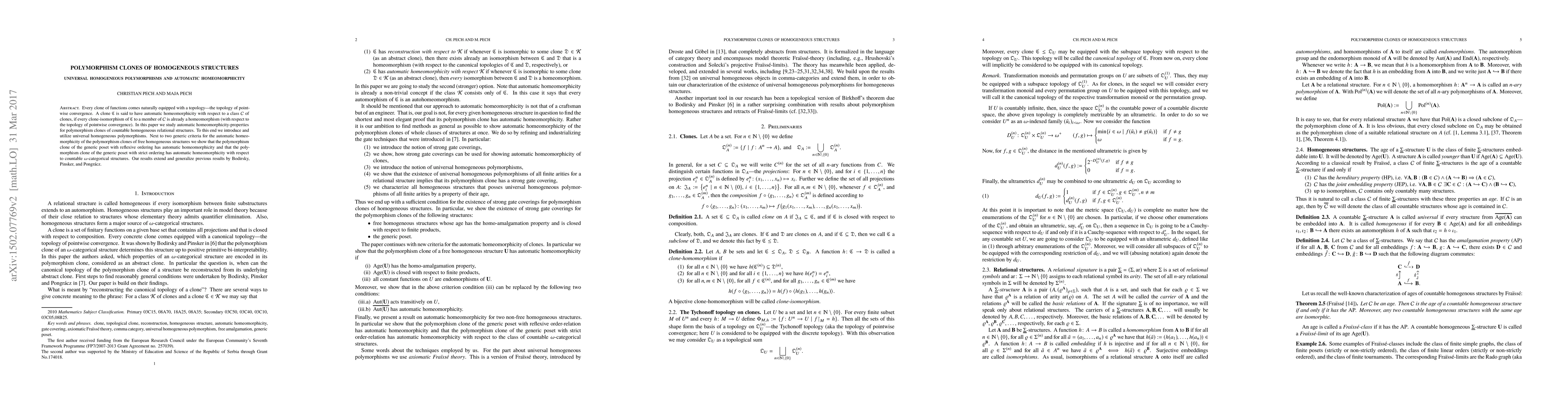 This paper investigates the automatic homeomorphicity of polymorphism clones in countable homogeneous relational structures, introducing universal homogeneous polymorphisms and establishing criteria for such properties. It also demonstrates that certain posets exhibit automatic homeomorphicity with respect to countable $\omega$-categorical structures, extending prior work by Bodirsky, Pinsker, and Pongrácz.