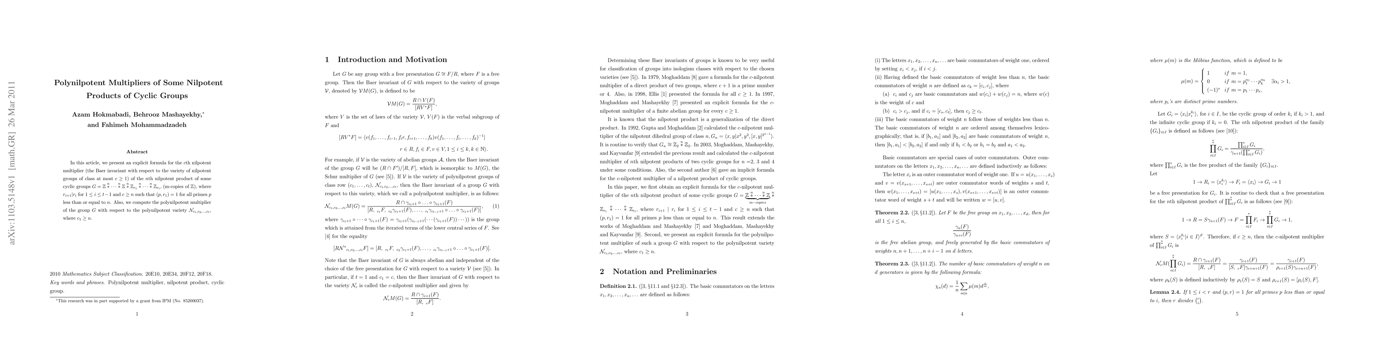 In this article, we present an explicit formula for the $c$th nilpotent multiplier (the Baer invariant with respect to the variety of nilpotent groups of class at most $c\geq 1$) of the $n$th nilpotent product of some cyclic groups $G={\mathbb {Z}}\stackrel{n}{*} ... \stackrel{n}{*}{\mathbb {Z}}\stackrel{n}{*} {\mathbb {Z}}_{r_1}\stackrel{n}{*} ... \stackrel{n}{*}{\mathbb{Z}}_{r_t}$, (m-copies of $\mathbb {Z}$), where $r_{i+1} | r_i$ for $1 \leq i \leq t-1$ and $c \geq n$ such that $ (p,r_1)=1$ for all primes $p$ less than or equal to $n$. Also, we compute the polynilpotent multiplier of the group $G$ with respect to the polynilpotent variety ${\mathcal N}_{c_1,c_2,...,c_t}$, where $c_1 \geq n.$