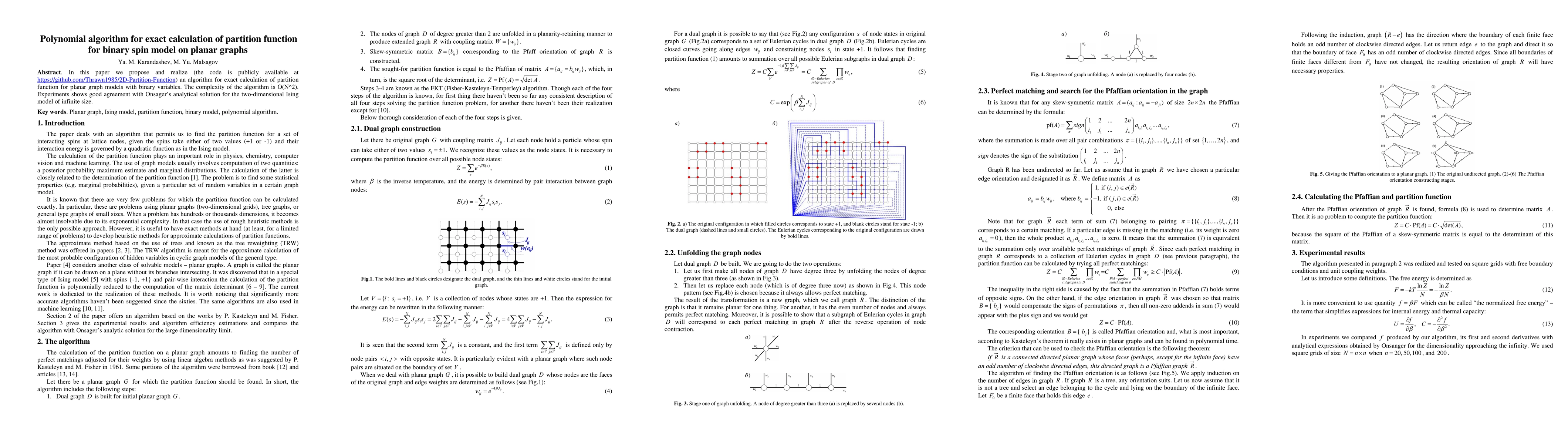 This paper presents a polynomial algorithm with O(N^2) complexity for calculating the partition function of binary spin models on planar graphs, demonstrating its effectiveness through agreement with Onsager's analytical solution for the infinite-size 2D Ising model. The algorithm's code is publicly accessible for further validation.