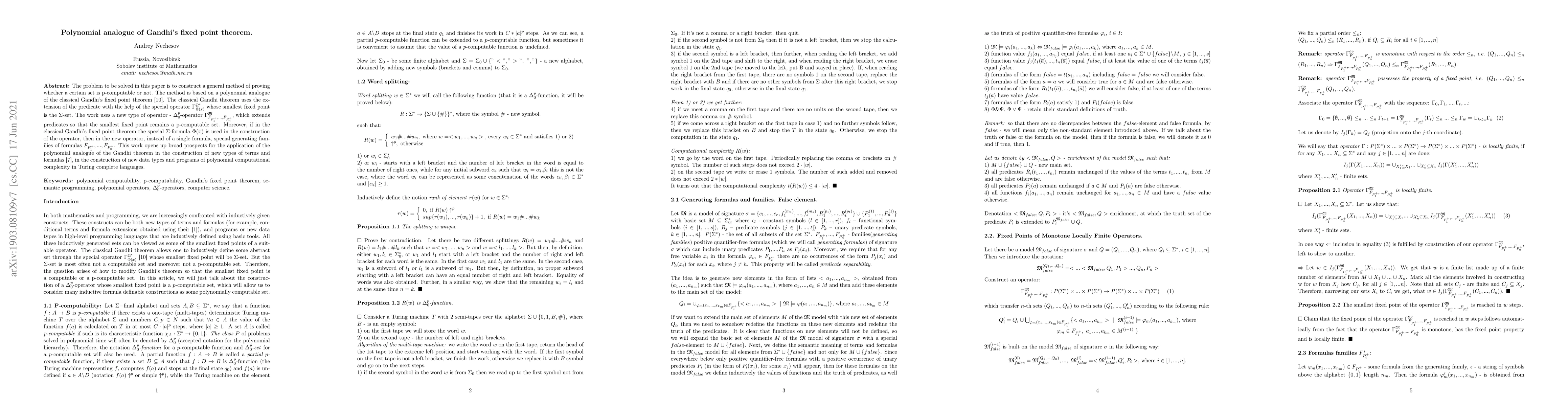 The paper constructs a polynomial analogue of Gandhi's fixed point theorem using a new $\Delta_0^p$-operator $\Gamma_{F_{P_1^{+}},...,F_{P_n^{+}}}^{\mathfrak{M}}$, which extends predicates to maintain p-computable sets.
