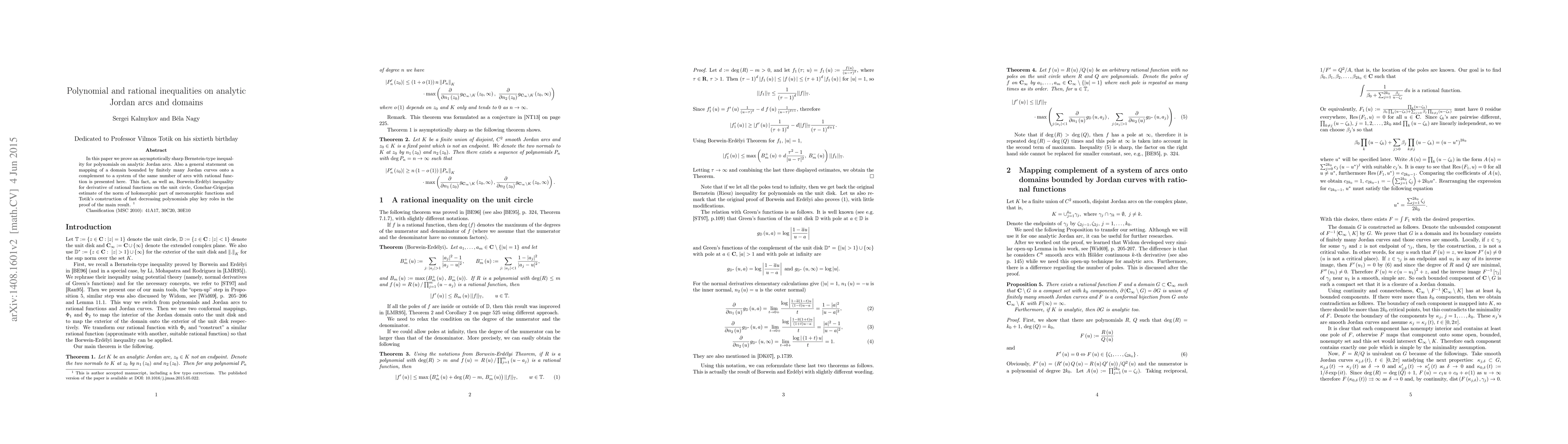 This paper establishes an asymptotically sharp Bernstein-type inequality for polynomials on analytic Jordan arcs and presents a mapping theorem for domains bounded by Jordan curves to complements of arcs using rational functions. Key results include the Borwein-Erd\'elyi inequality and Totik's construction for polynomial approximation.