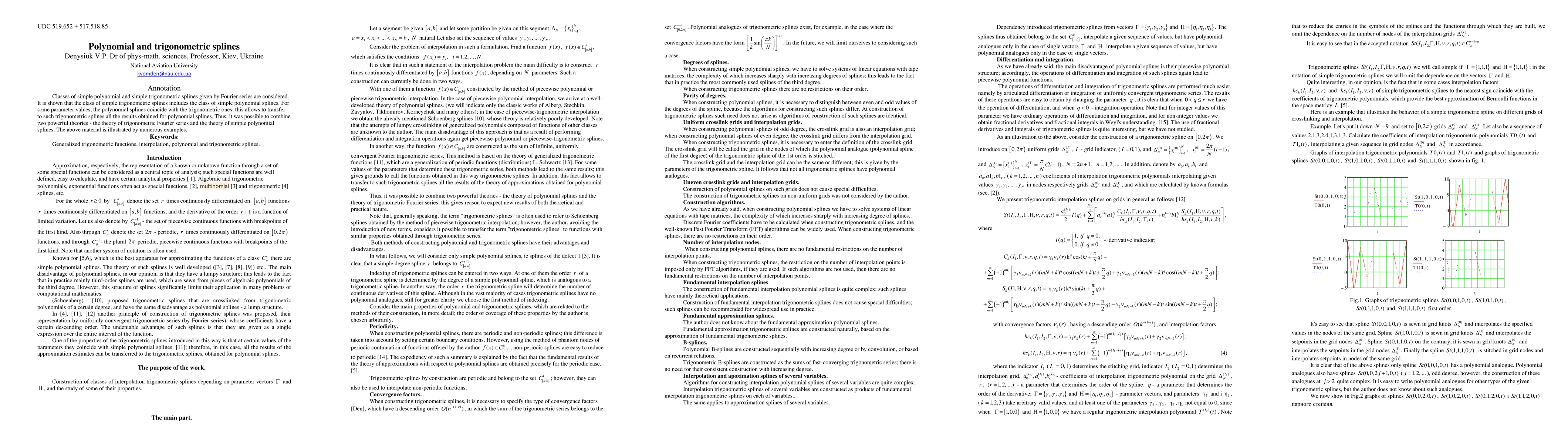 This research examines polynomial and trigonometric splines represented by Fourier series, showing that simple trigonometric splines encompass simple polynomial splines. It demonstrates parameter values where polynomial splines match trigonometric ones, thereby merging the theories of Fourier series and simple polynomial splines.