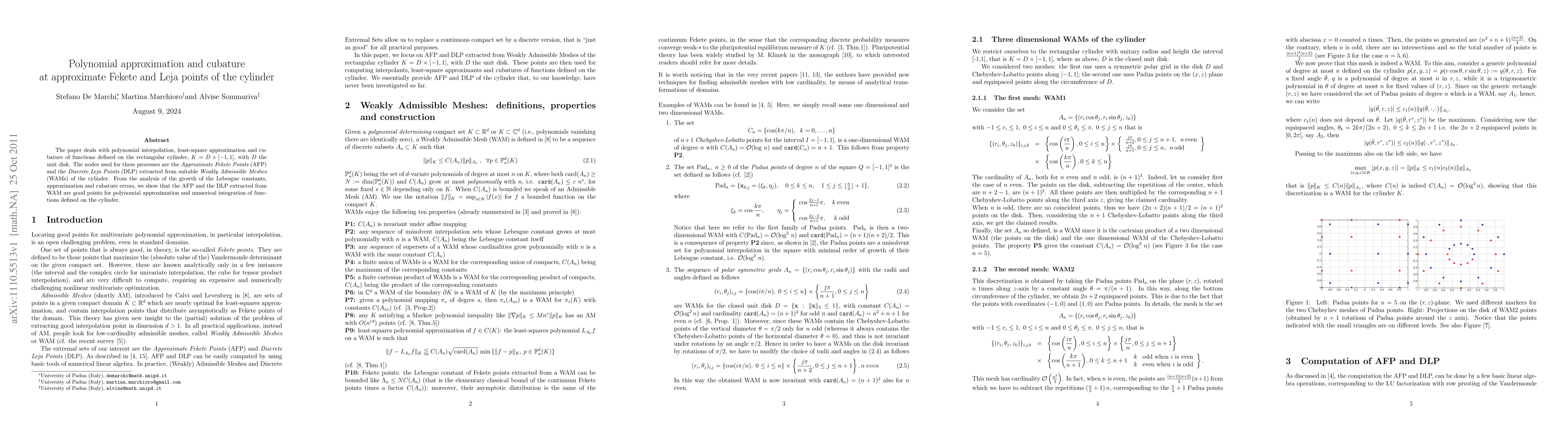 This paper investigates polynomial interpolation, least-square approximation, and cubature for functions on the rectangular cylinder using Approximate Fekete Points (AFP) and Discrete Leja Points (DLP) derived from Weakly Admissible Meshes (WAMs). The analysis shows that these points effectively minimize approximation and cubature errors.