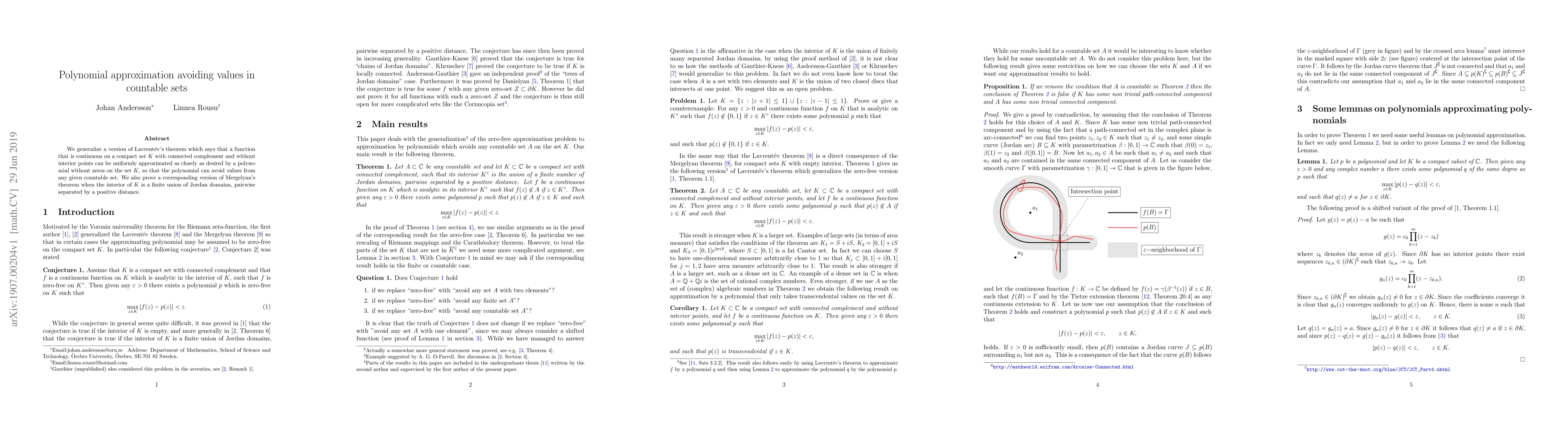 Researchers generalize Lavrentev's theorem to prove that a continuous function on a compact set can be approximated closely by a polynomial without zeros, allowing it to avoid values from any countable set. They also extend this result to finite unions of Jordan domains separated by positive distances.