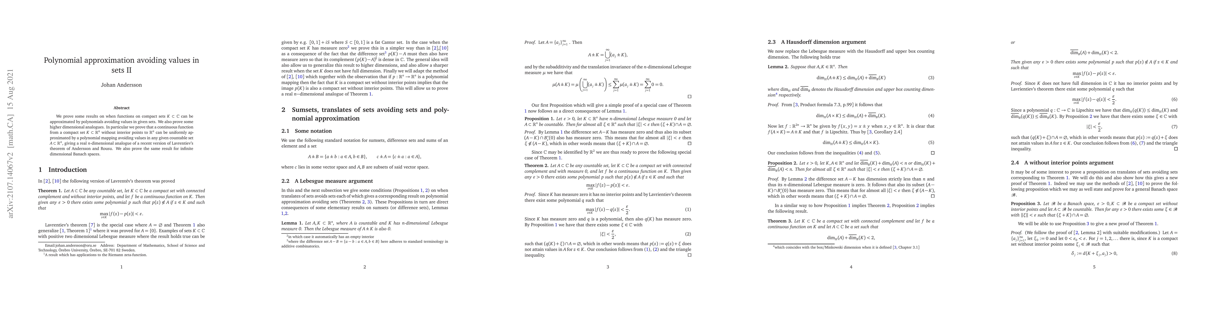 Research proves that functions on compact sets can be approximated by polynomials avoiding specific values in countable sets, extending a theorem to higher dimensions.