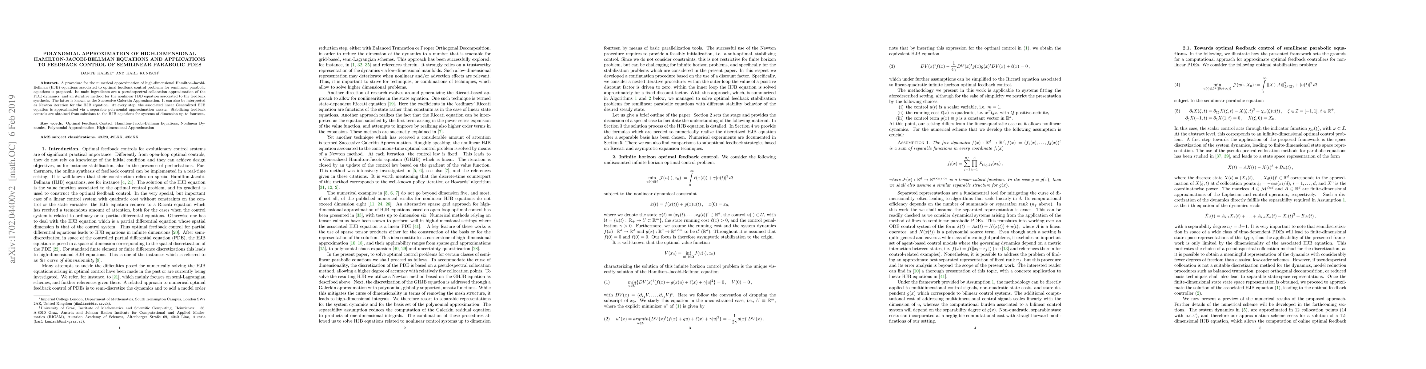 This paper proposes a numerical method for approximating high-dimensional Hamilton-Jacobi-Bellman equations in optimal feedback control of semilinear parabolic PDEs, using pseudospectral collocation and Successive Galerkin Approximation with separable polynomial approximations, achieving stabilizing feedback controls for systems up to fourteen dimensions.