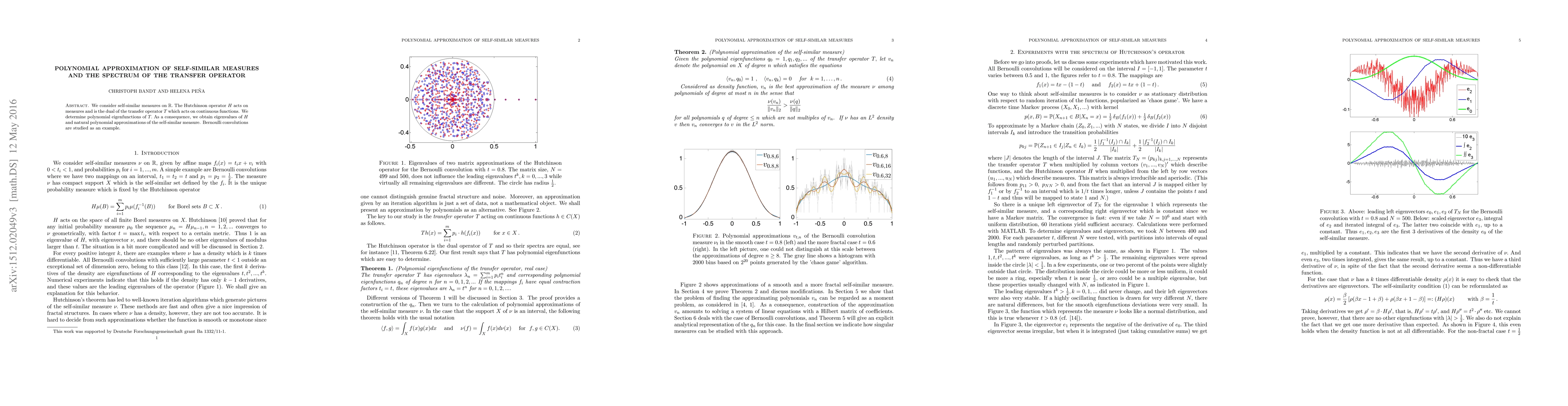 We consider self-similar measures on $\mathbb R.$ The Hutchinson operator $H$ acts on measures and is the dual of the transfer operator $T$ which acts on continuous functions. We determine polynomial eigenfunctions of $T .$ As a consequence, we obtain eigenvalues of $H$ and natural polynomial approximations of the self-similar measure. Bernoulli convolutions are studied as an example.
