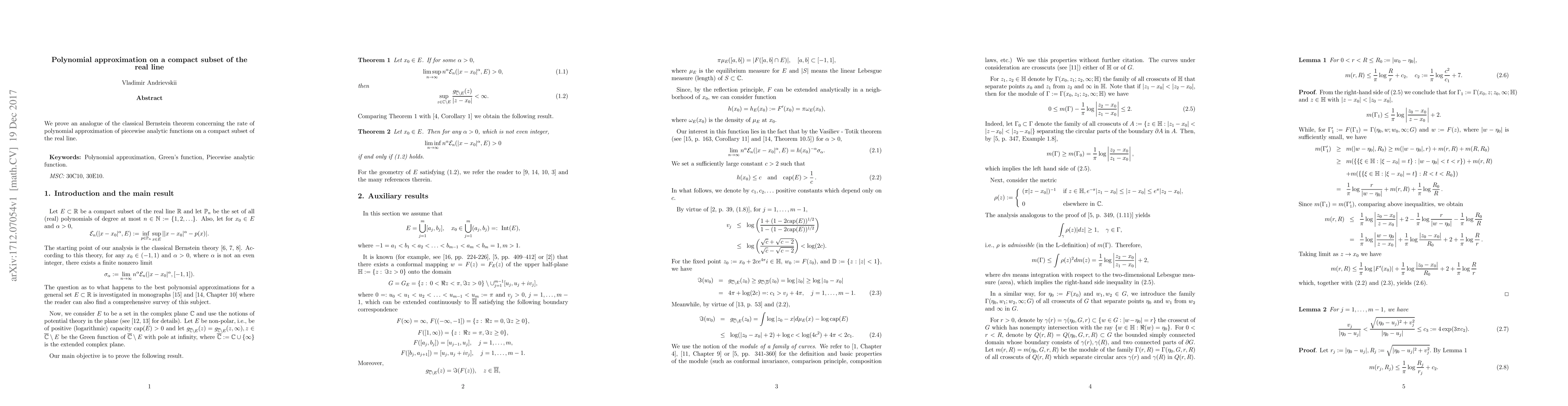 Summary: This paper establishes an analogue of Bernstein's theorem for polynomial approximation rates of piecewise analytic functions on compact subsets of the real line, providing a detailed analysis of the approximation process.