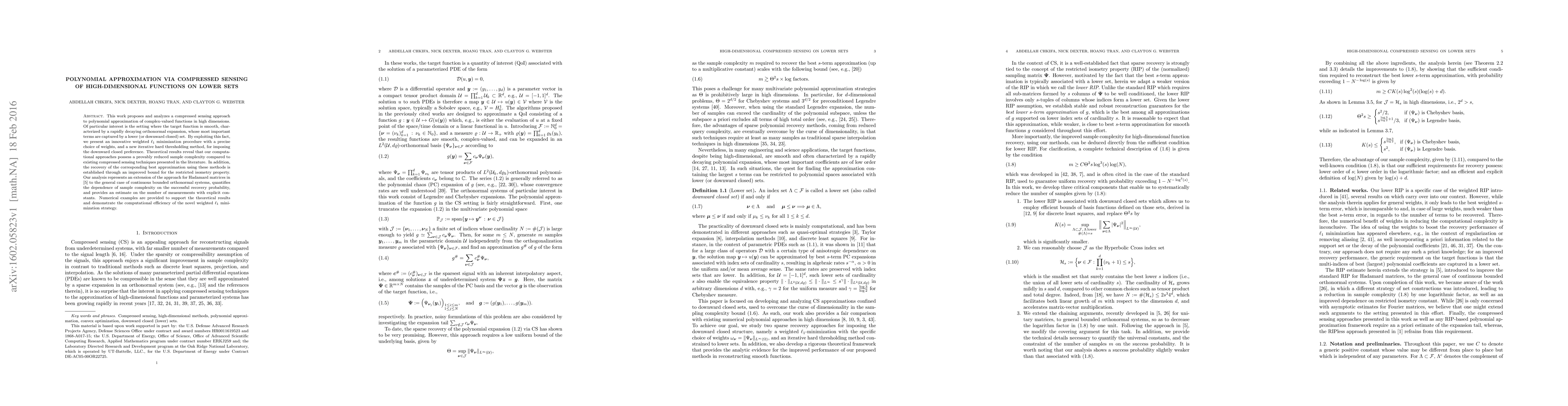 This work proposes and analyzes a compressed sensing approach to polynomial approximation of complex-valued functions in high dimensions. Of particular interest is the setting where the target function is smooth, characterized by a rapidly decaying orthonormal expansion, whose most important terms are captured by a lower (or downward closed) set. By exploiting this fact, we present an innovative weighted $\ell_1$ minimization procedure with a precise choice of weights, and a new iterative hard thresholding method, for imposing the downward closed preference. Theoretical results reveal that our computational approaches possess a provably reduced sample complexity compared to existing compressed sensing techniques presented in the literature. In addition, the recovery of the corresponding best approximation using these methods is established through an improved bound for the restricted isometry property. Our analysis represents an extension of the approach for Hadamard matrices in [5] to the general case of continuous bounded orthonormal systems, quantifies the dependence of sample complexity on the successful recovery probability, and provides an estimate on the number of measurements with explicit constants. Numerical examples are provided to support the theoretical results and demonstrate the computational efficiency of the novel weighted $\ell_1$ minimization strategy.
