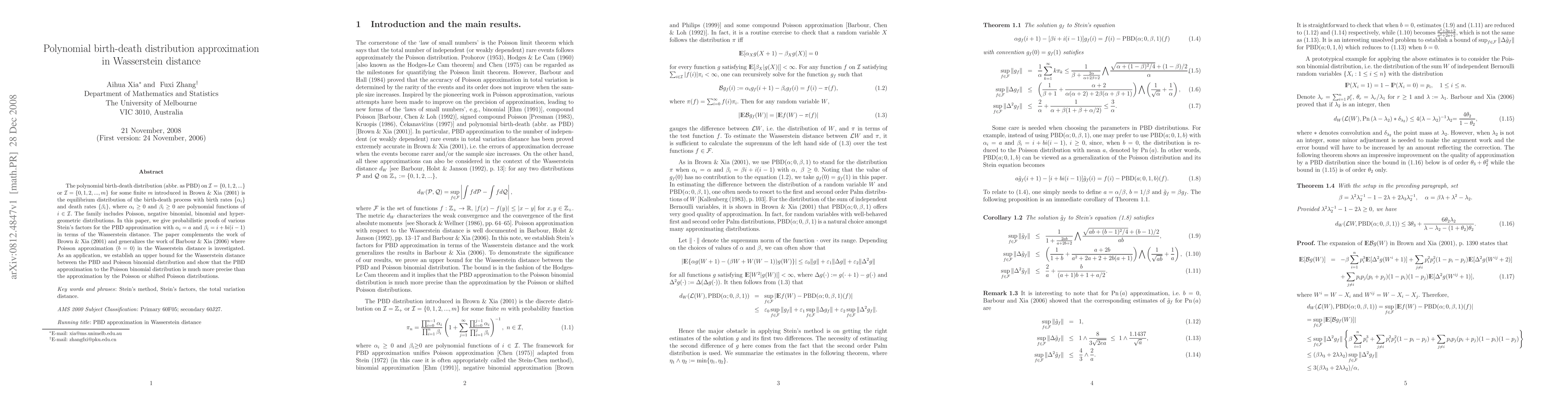 This paper provides probabilistic proofs for Stein's factors in approximating the polynomial birth-death distribution (PBD) using Wasserstein distance, extending previous work on Poisson approximation. It establishes a more precise PBD approximation to the Poisson binomial distribution compared to Poisson or shifted Poisson approximations.