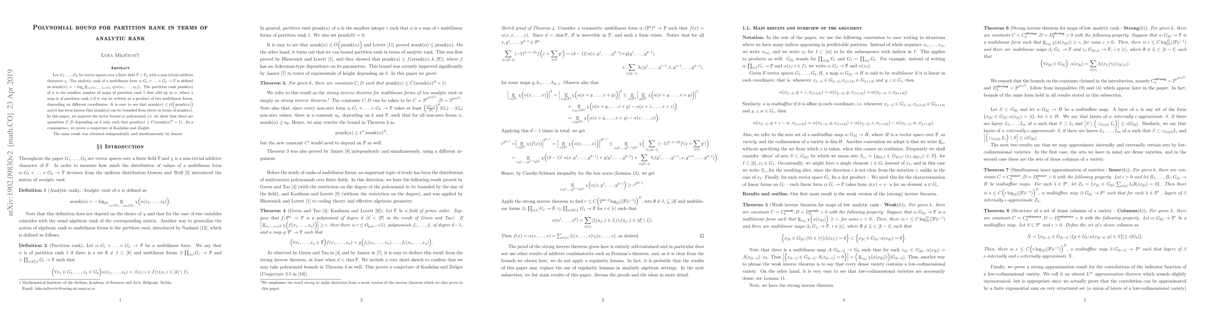 This paper establishes a polynomial bound for the partition rank of multilinear forms in terms of their analytic rank, showing $\operatorname{prank}(\alpha) \leq C (\operatorname{arank}(\alpha)^D + 1)$ for certain constants $C, D$ dependent on $k$. This result also confirms a conjecture by Kazhdan and Ziegler.
