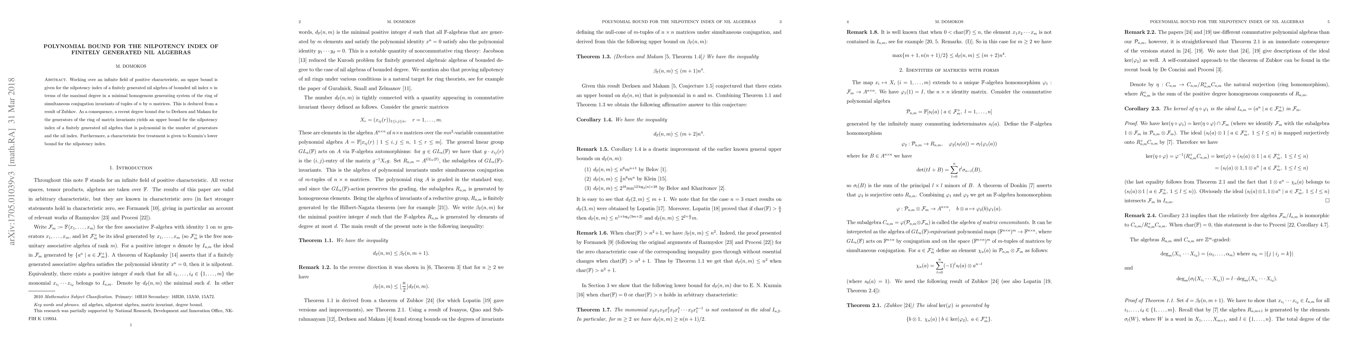 Working over an infinite field of positive characteristic, an upper bound is given for the nilpotency index of a finitely generated nil algebra of bounded nil index $n$ in terms of the maximal degree in a minimal homogenous generating system of the ring of simultaneous conjugation invariants of tuples of $n$ by $n$ matrices. This is deduced from a result of Zubkov. As a consequence, a recent degree bound due to Derksen and Makam for the generators of the ring of matrix invariants yields an upper bound for the nilpotency index of a finitely generated nil algebra that is polynomial in the number of generators and the nil index. Furthermore, a characteristic free treatment is given to Kuzmin's lower bound for the nilpotency index.