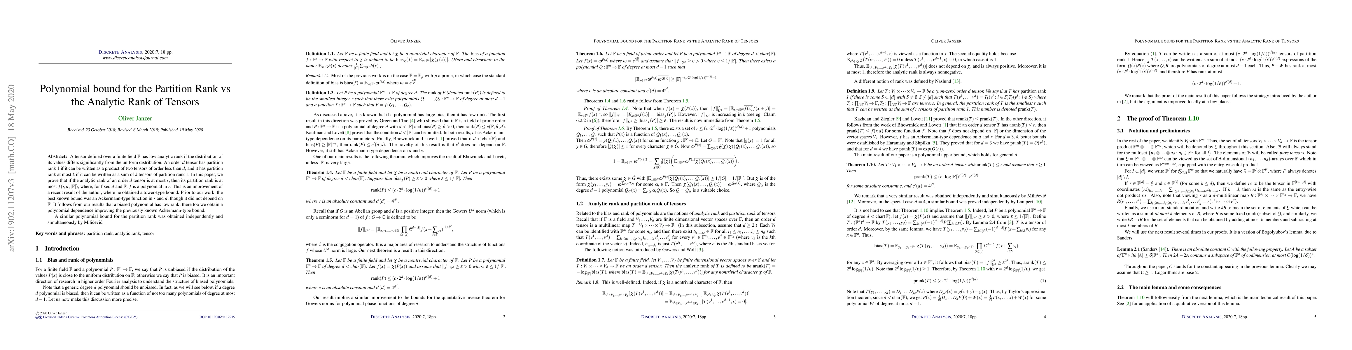 This paper establishes a polynomial bound for the partition rank of tensors in terms of their analytic rank, improving upon previous tower-type and Ackermann-type bounds. The authors demonstrate that for a tensor of order $d$ over a finite field $\mathbb{F}$, if its analytic rank is at most $r$, its partition rank is at most $f(r,d,|\mathbb{F}|)$, where $f$ is a polynomial in $r$.