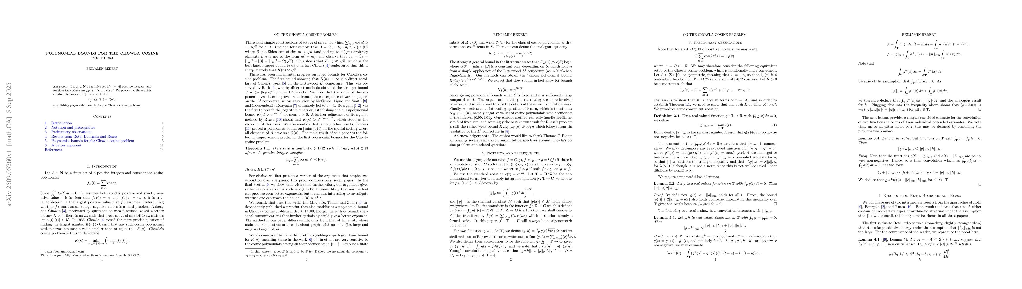 Let $A\subset \mathbf{N}$ be a finite set of $n=|A|$ positive integers, and consider the cosine sum $f_A(t)=\sum_{a\in A}\cos at$. We prove that there exists an absolute constant $c\geqslant 1/12$ such that $$\min_t f_A(t)\leqslant -\Omega(n^c),$$ establishing polynomial bounds for the Chowla cosine problem.