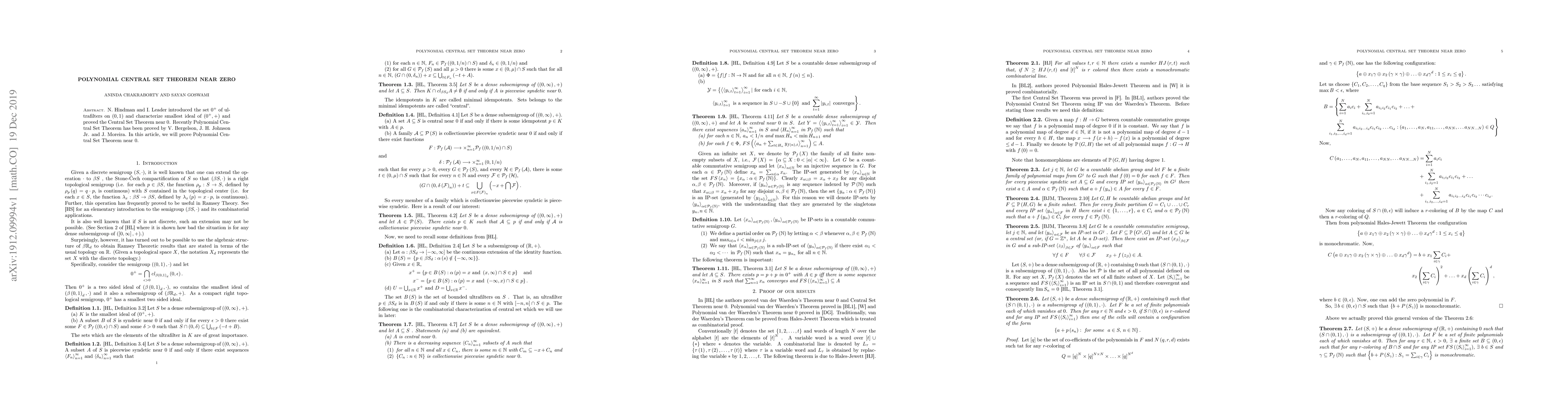 N. Hindman and I. Leader introduced the set of ultrafilters 0+ on (0,1) and characterize smallest ideal of (0+,+) and proved the Central Set Theorem near zero. Recently Polynomial Central Set Theorem has been proved by V. Bergelson, J. H. Johnson Jr. and J. Moreira. In this article, we will prove Polynomial Central Set Theorem near zero.
