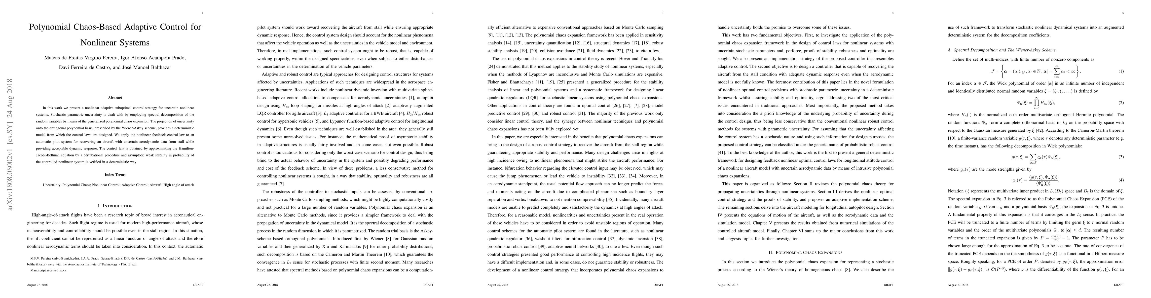 In this work we present a nonlinear adaptive suboptimal control strategy for uncertain nonlinear systems. Stochastic parametric uncertainty is dealt with by employing spectral decomposition of the random variables by means of the generalized polynomial chaos expansion. The projection of uncertainty onto the orthogonal polynomial basis, prescribed by the Wiener-Askey scheme, provides a deterministic model from which the control laws are designed. We apply the nonlinear feedback control law to an automatic pilot system for recovering an aircraft with uncertain aerodynamic data from stall while providing acceptable dynamic response. The control law is obtained by approximating the Hamilton-Jacobi-Bellman equation by a pertubational procedure and asymptotic weak stability in probability of the controlled nonlinear system is verified in a deterministic way.