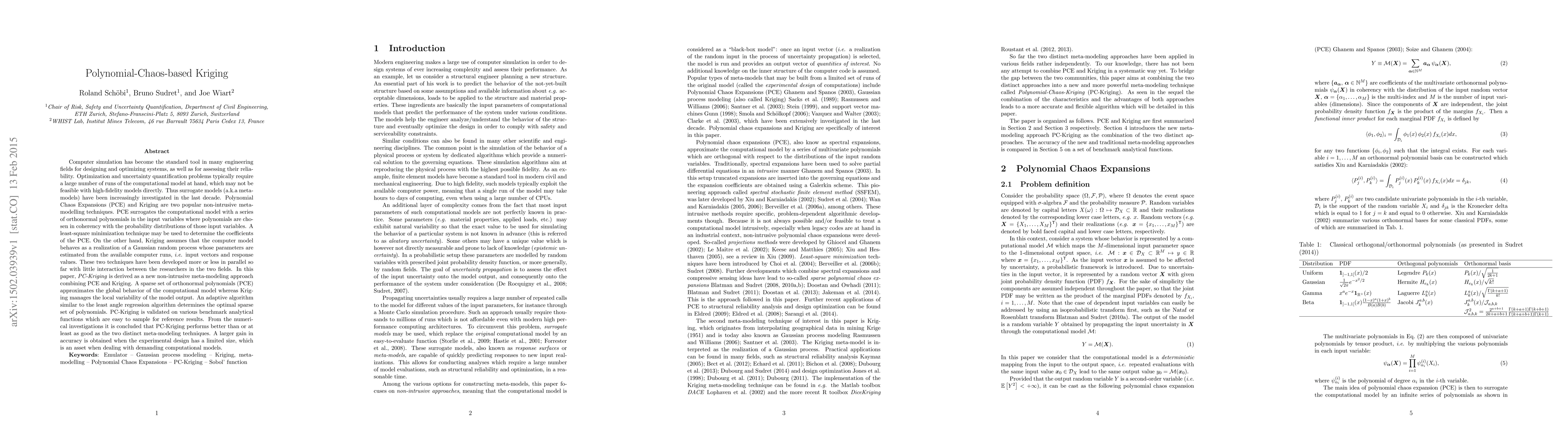 This paper introduces PC-Kriging, a novel non-intrusive meta-modeling approach combining Polynomial Chaos Expansions (PCE) and Kriging. The method uses PCE to approximate the global behavior of computational models and Kriging to manage local variability, validated on benchmark functions, showing improved performance over standalone PCE or Kriging, especially with limited experimental design.