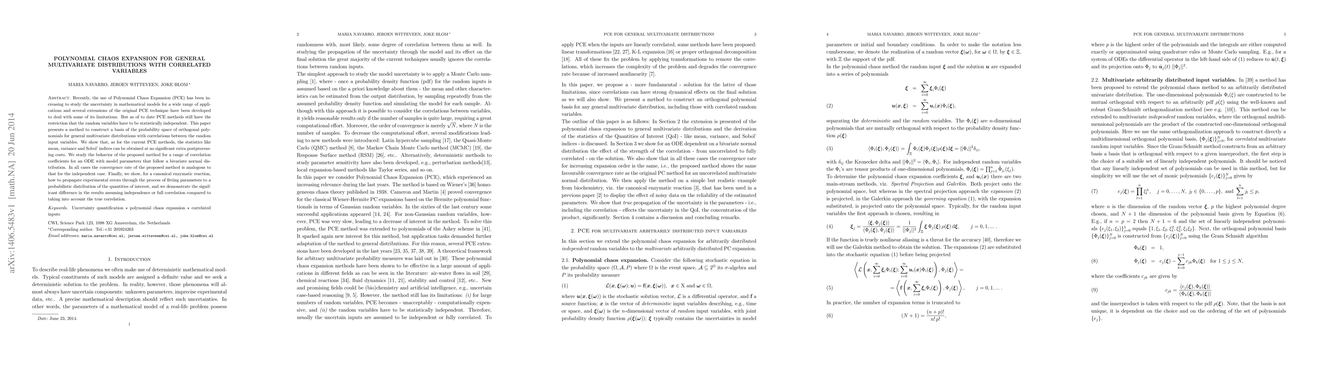 Recently, the use of Polynomial Chaos Expansion (PCE) has been increasing to study the uncertainty in mathematical models for a wide range of applications and several extensions of the original PCE technique have been developed to deal with some of its limitations. But as of to date PCE methods still have the restriction that the random variables have to be statistically independent. This paper presents a method to construct a basis of the probability space of orthogonal polynomials for general multivariate distributions with correlations between the random input variables. We show that, as for the current PCE methods, the statistics like mean, variance and Sobol' indices can be obtained at no significant extra postprocessing costs. We study the behavior of the proposed method for a range of correlation coefficients for an ODE with model parameters that follow a bivariate normal distribution. In all cases the convergence rate of the proposed method is analogous to that for the independent case. Finally, we show, for a canonical enzymatic reaction, how to propagate experimental errors through the process of fitting parameters to a probabilistic distribution of the quantities of interest, and we demonstrate the significant difference in the results assuming independence or full correlation compared to taking into account the true correlation.