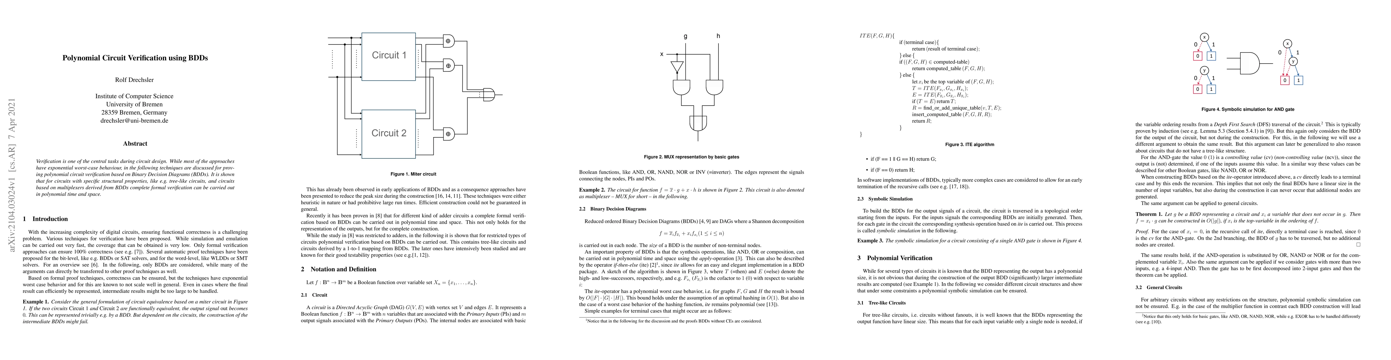Summary: This paper proposes a polynomial time and space verification technique for specific circuit types using Binary Decision Diagrams (BDDs), demonstrating complete formal verification for tree-like circuits and multiplexer-based circuits derived from BDDs.