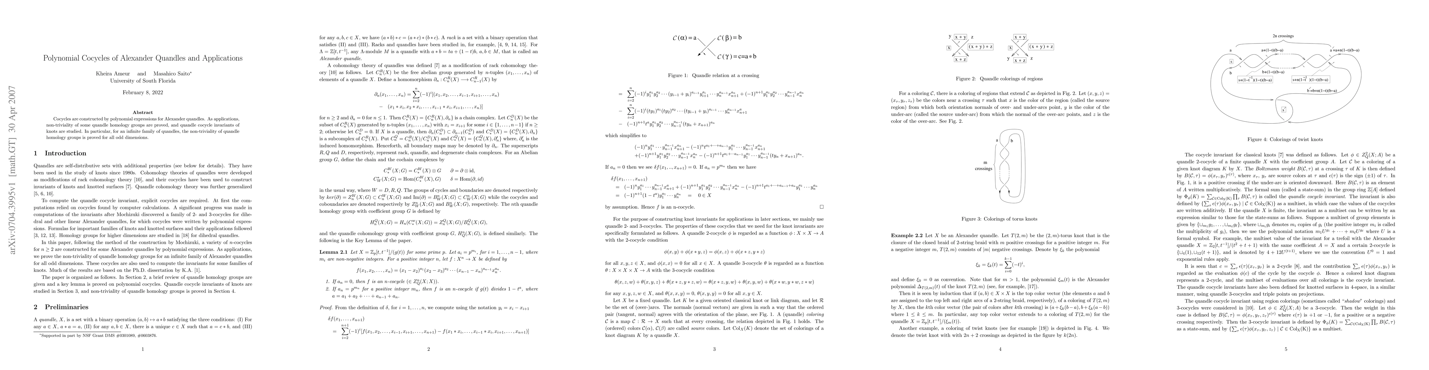 Summary: This paper constructs polynomial cocycles for Alexander quandles, proving non-triviality of certain quandle homology groups and exploring quandle cocycle invariants for knots, especially showing non-triviality in all odd dimensions for an infinite quandle family.