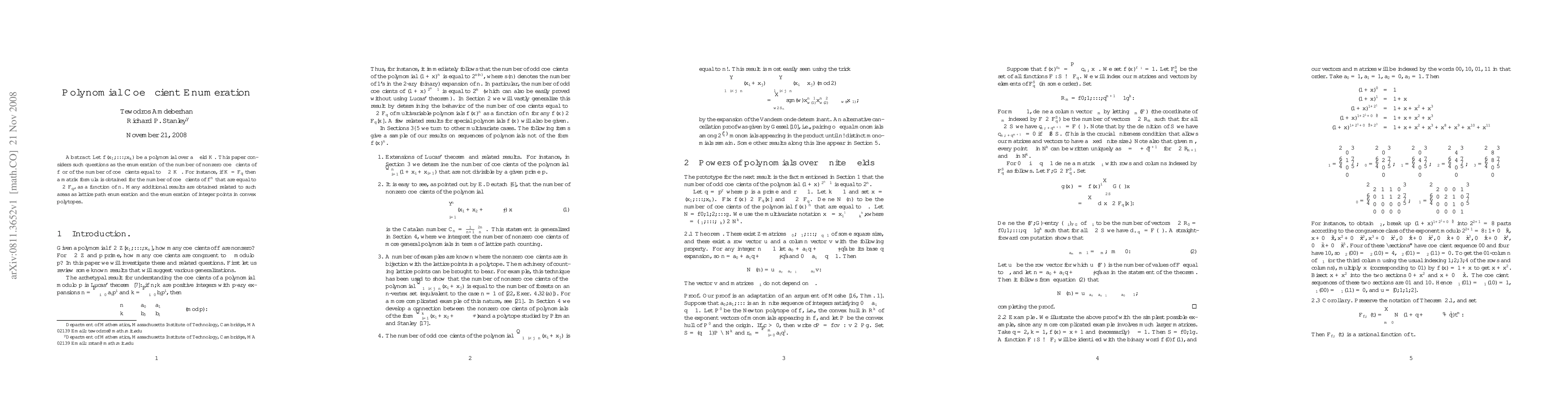 This paper explores the enumeration of nonzero coefficients and specific coefficient values in polynomials over a field $K$, with a focus on finite fields $\ff_q$. It derives matrix formulas for counting coefficients in powers of polynomials and connects these results to lattice path enumeration and integer point counting in convex polytopes.