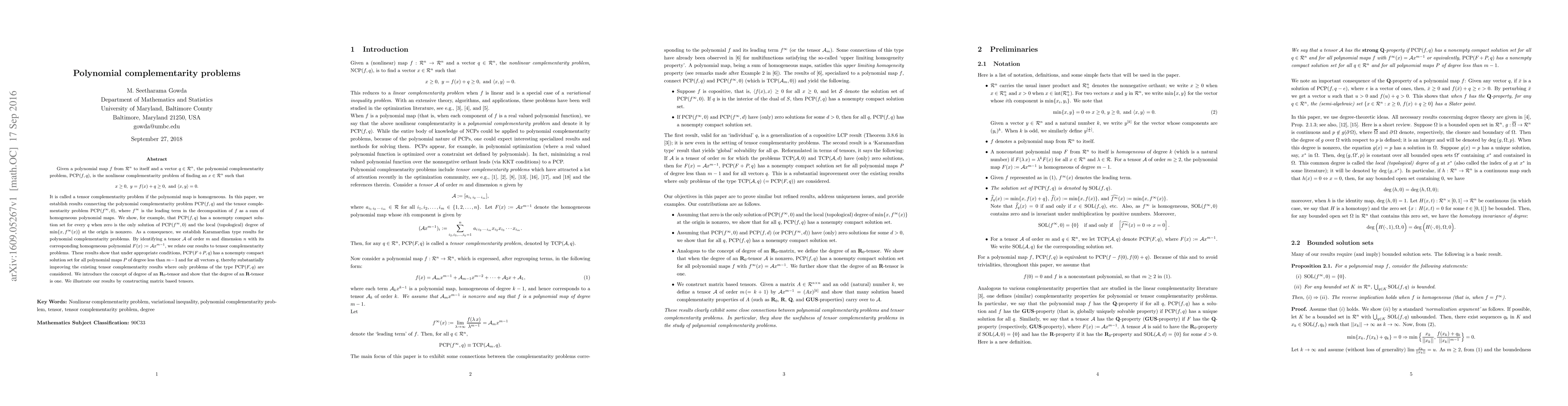 Given a polynomial map f on the Euclidean n-space and a vector q, the polynomial complementarity problem, PCP(f,q), is the nonlinear complementarity problem of finding a nonnegative vector x such that y=f(x)+q is nonnegative and orthogonal to x. It is called a tensor complementarity problem if the polynomial map is homogeneous. In this paper, we establish results connecting the polynomial complementarity problem PCP(f,q) and the tensor complementarity problem PCP(f*,0), where f* is the leading term in the decomposition of f as a sum of homogeneous polynomial maps. We show, for example, that PCP(f,q) has a nonempty compact solution set for every q when zero is the only solution of PCP(f*,0)and the local (topological) degree of min{x,f*(x)} at the origin is nonzero. As a consequence, we establish Karamardian type results for polynomial complementarity problems. By identifying a tensor A of order m and dimension n with its corresponding homogeneous polynomial F(x):= Ax^{m-1}, we relate our results to tensor complementarity problems. These results show that under appropriate conditions, PCP(F+P,q) has a nonempty compact solution set for all polynomial maps P of degree less than m-1 and for all vectors q, thereby substantially improving the existing tensor complementarity results where only problems of the type PCP(F,q) are considered. We introduce the concept of degree of an R_0-tensor and show that the degree of an R-tensor is one. We illustrate our results by constructing matrix based tensors.