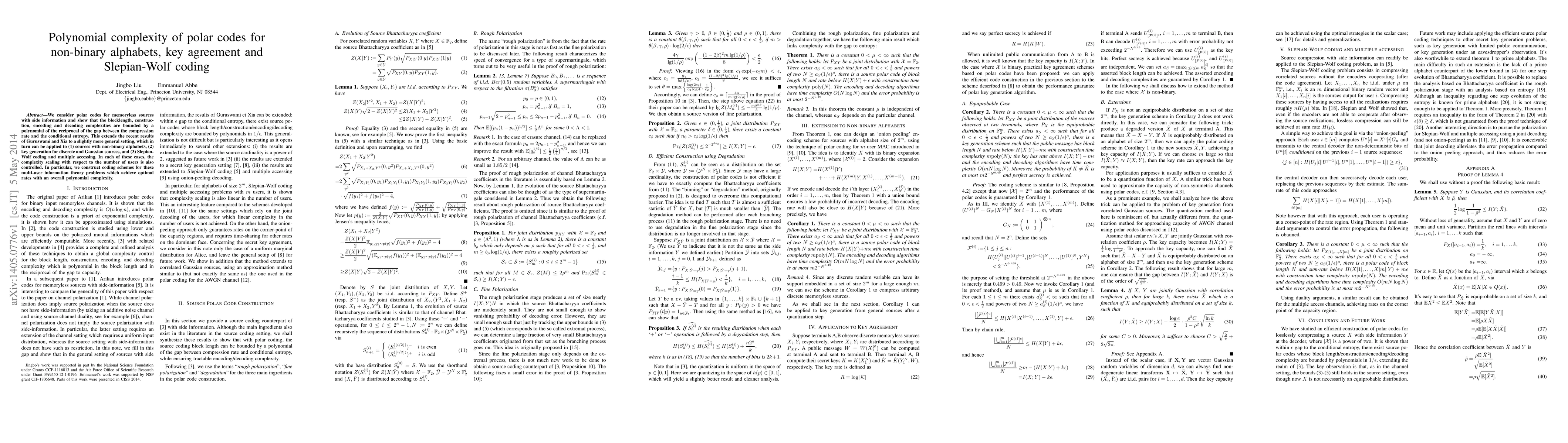This paper extends polynomial complexity results for polar codes to non-binary alphabets, key agreement, and Slepian-Wolf coding, demonstrating that complexities scale polynomially with respect to the compression rate gap. The proposed coding schemes achieve optimal rates with polynomial complexity for multi-user information theory problems.
