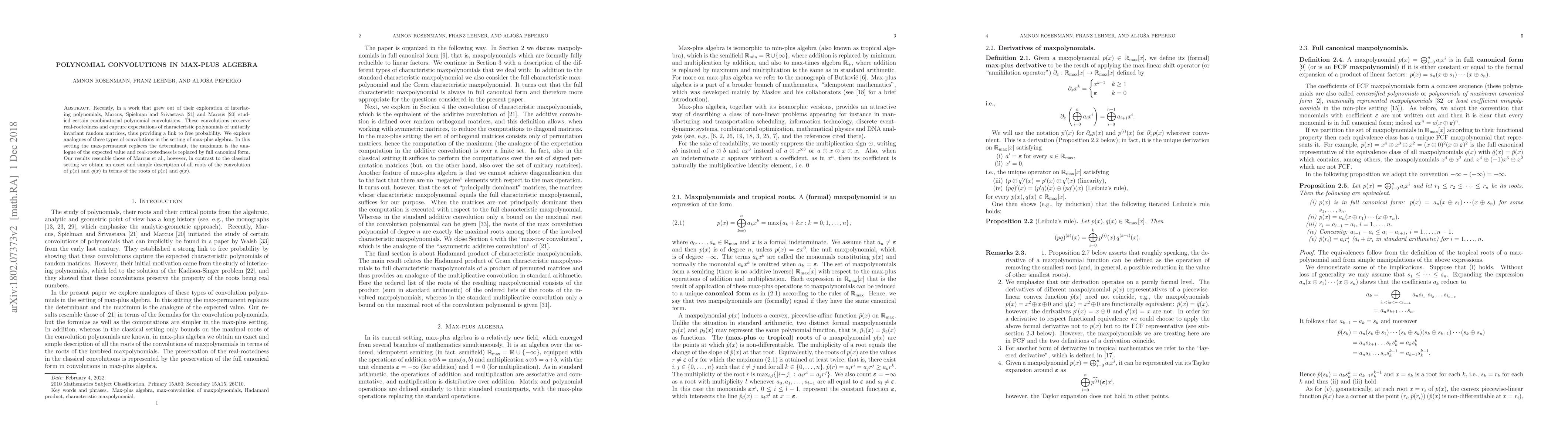 This paper explores polynomial convolutions in the context of max-plus algebra, where the determinant is replaced by the max-permanent, and real-rootedness by full canonical form. The authors find that their results mirror those in classical polynomial convolutions, but with an exact and simple description of all roots.