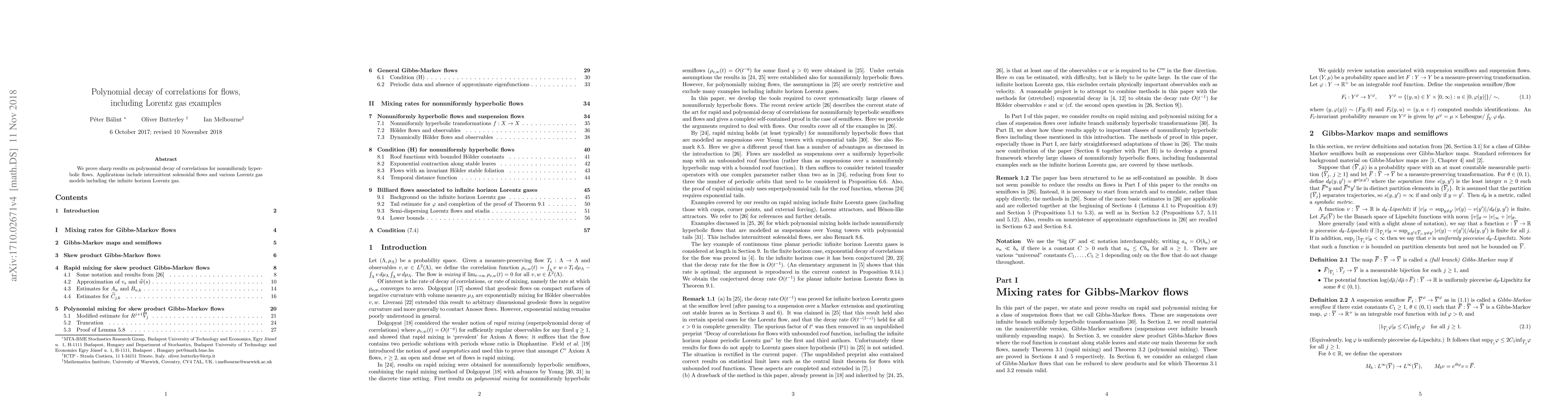 Summary: The paper establishes precise results on polynomial decay of correlations for nonuniformly hyperbolic flows, demonstrating these properties through examples like intermittent solenoidal flows and various Lorentz gas models, including infinite horizon scenarios.