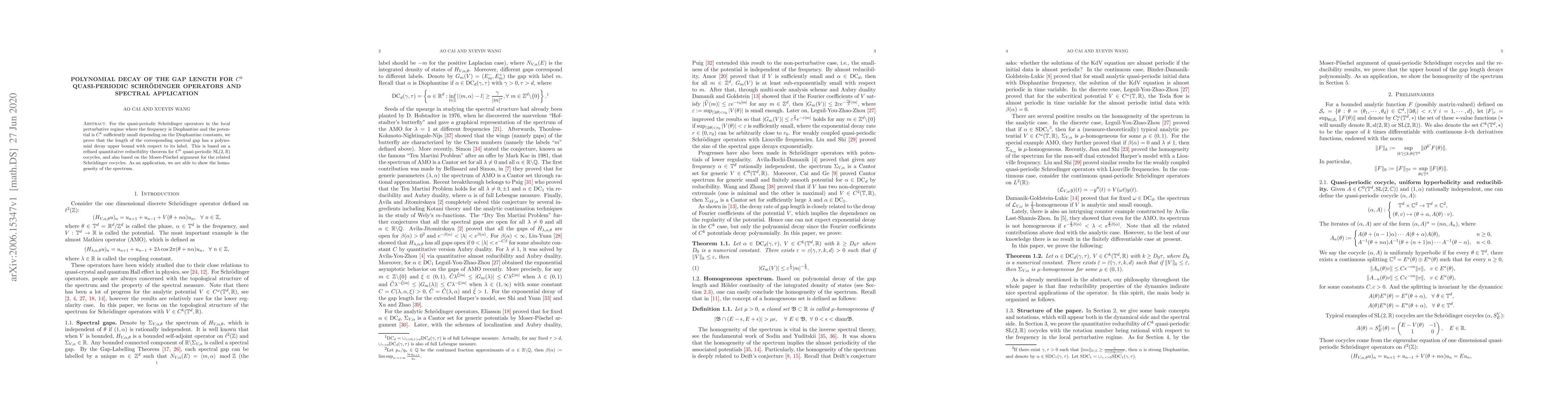 For the quasi-periodic Schr\"{o}dinger operators in the local perturbative regime where the frequency is Diophantine and the potential is $C^k$ sufficiently small depending on the Diophantine constants, we prove that the length of the corresponding spectral gap has a polynomial decay upper bound with respect to its label. This is based on a refined quantitative reducibility theorem for $C^k$ quasi-periodic ${\rm SL}(2,\mathbb{R})$ cocycles, and also based on the Moser-P\"{o}schel argument for the related Schr\"{o}dinger cocycles. As an application, we are able to show the homogeneity of the spectrum.